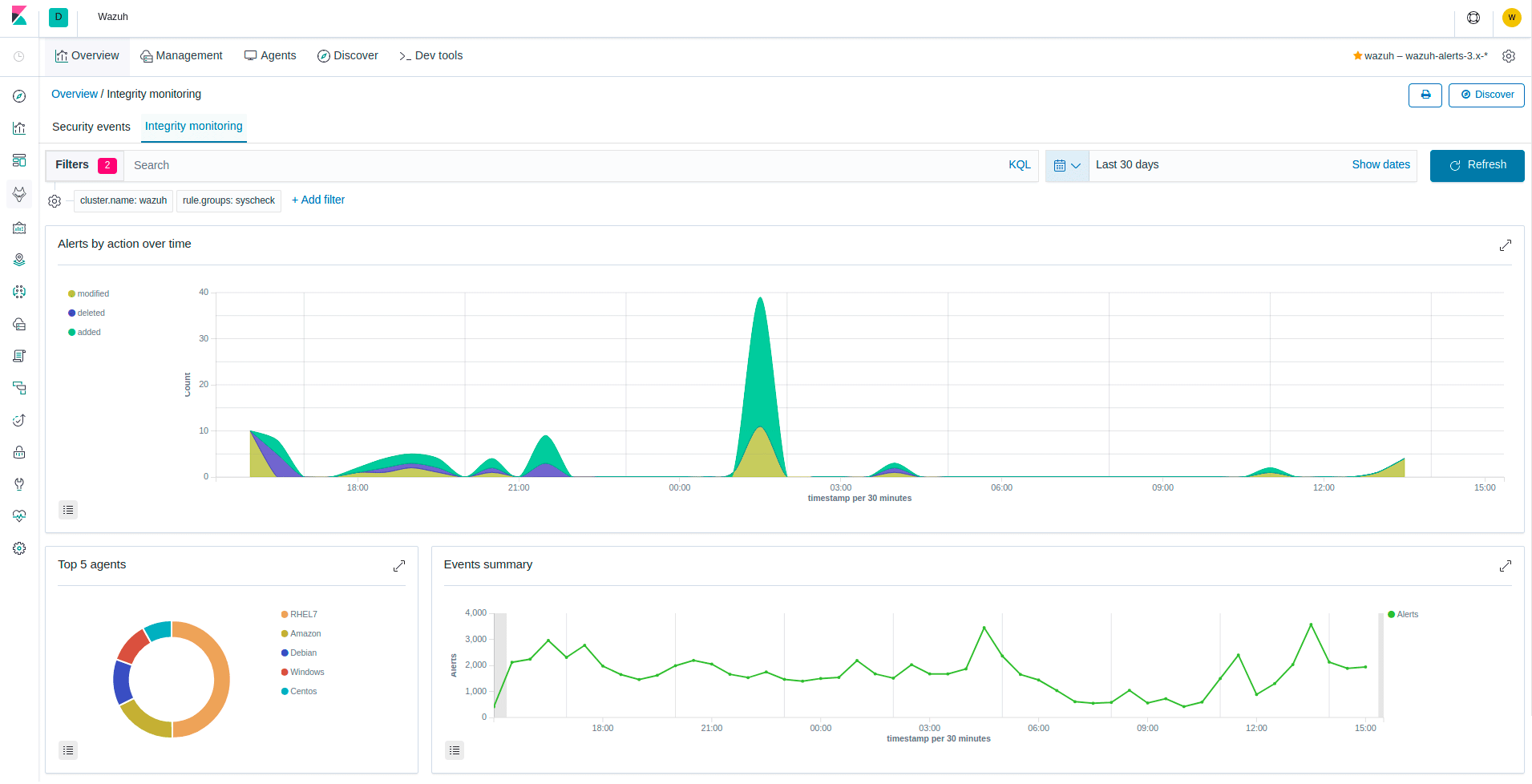 Wazuh monitors the file system, identifying changes in content, permissions, ownership, and attributes of files that you need to keep an eye on. In addition, it natively identifies users and applications used to create or modify files.