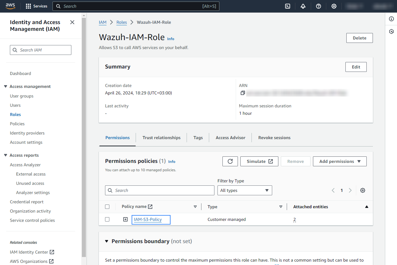 After updating the trust policy, copy the Amazon Resource Name (ARN) of the role as this will be used to configure the Wazuh module for AWS.