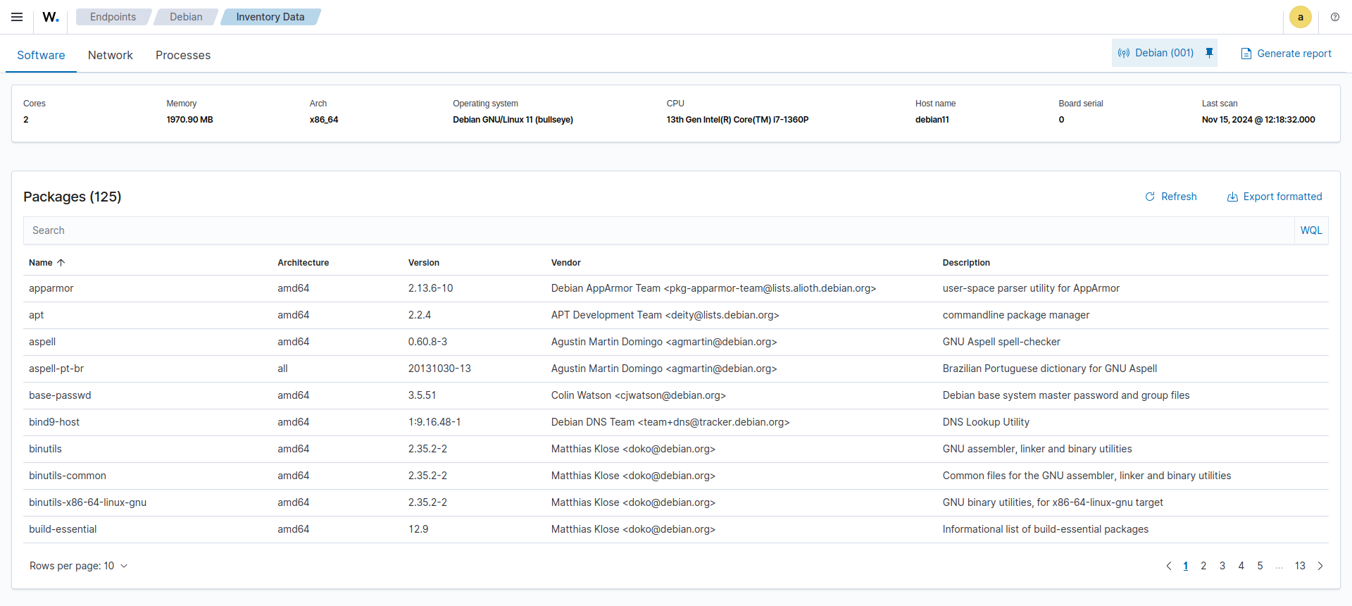Navigate to Agents management > Summary > AGENT_NAME > Inventory data on the Wazuh dashboard. Where AGENT_NAME is the monitored endpoint. Click Software, Network, and Processes to see details about the installed software, network services, and running processes on the endpoint.