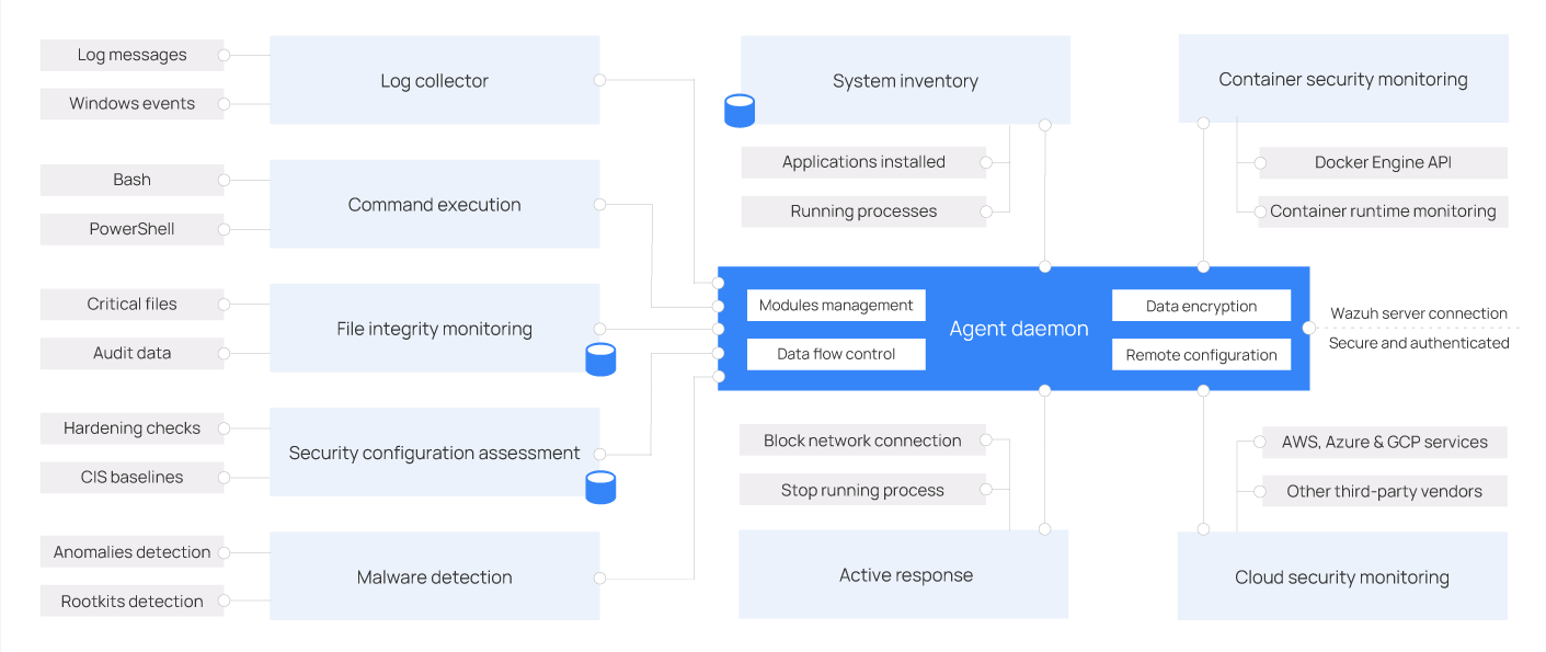 The Wazuh agent has a modular architecture. Each component is in charge of its own tasks, including monitoring the file system, reading log messages, collecting inventory data, scanning the system configuration, and looking for malware. Users can manage agent modules via configuration settings, adapting the solution to their particular use cases.