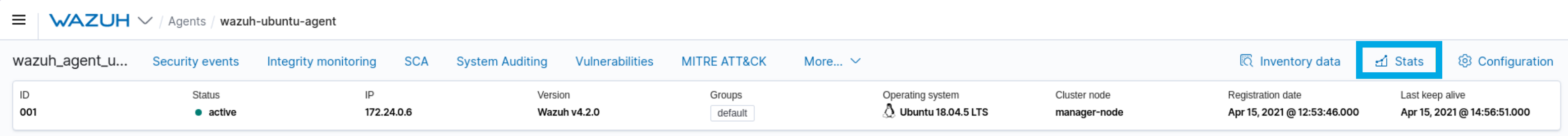 Wazuh adds a new Stats section that improves the visibility you have over agents’ statistics. You can access this feature by clicking Stats in the action ribbon on the Agent data overview page. This improvement allows you to visualize information fetched by the new API endpoint