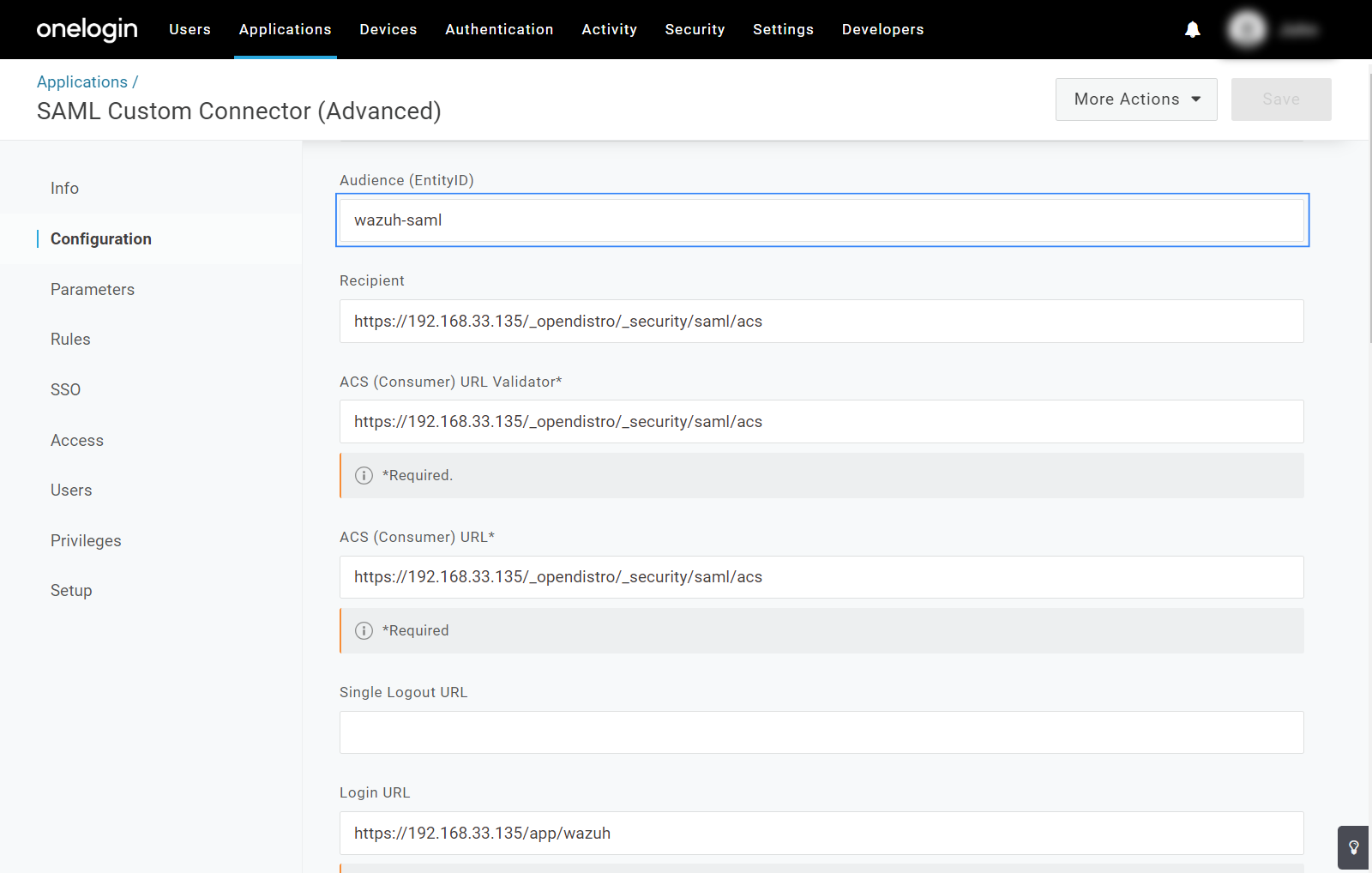 Wazuh. Navigate to the Configuration tab and fill in the information:Audience (EntityID):