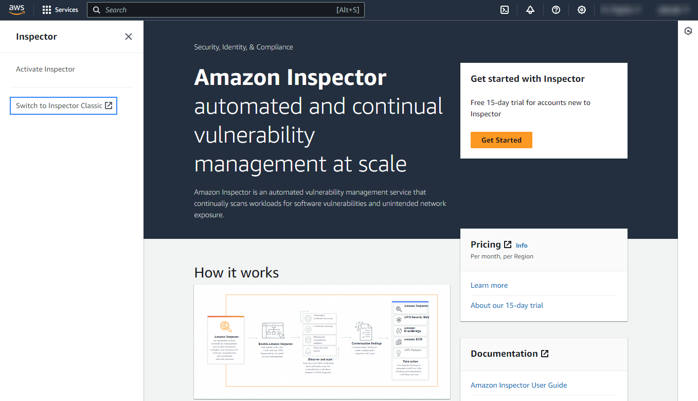 Amazon Inspector (v2) is available in your AWS account. To start using it: