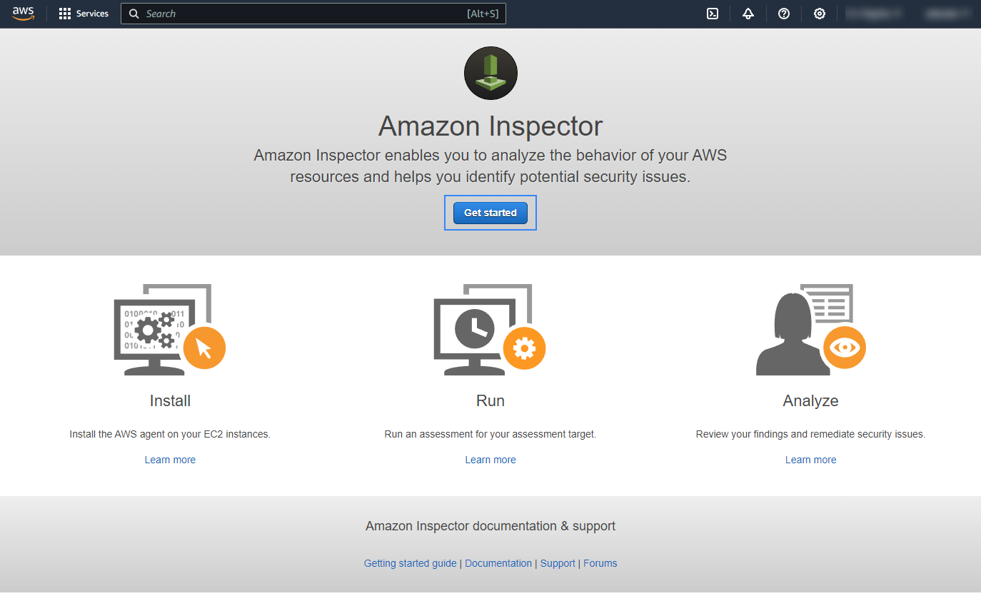 On the Amazon Inspector Classic page, click Get started.