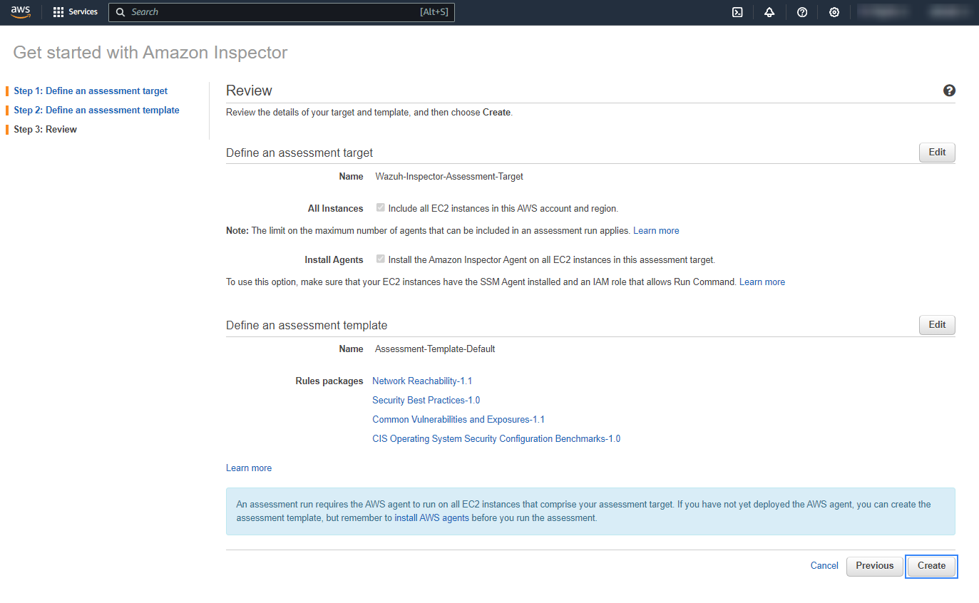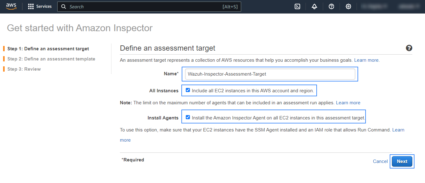 If you prefer to install the agents manually, disable the Install the Amazon Inspector Agent on all EC2 instances in this assessment target checkbox.