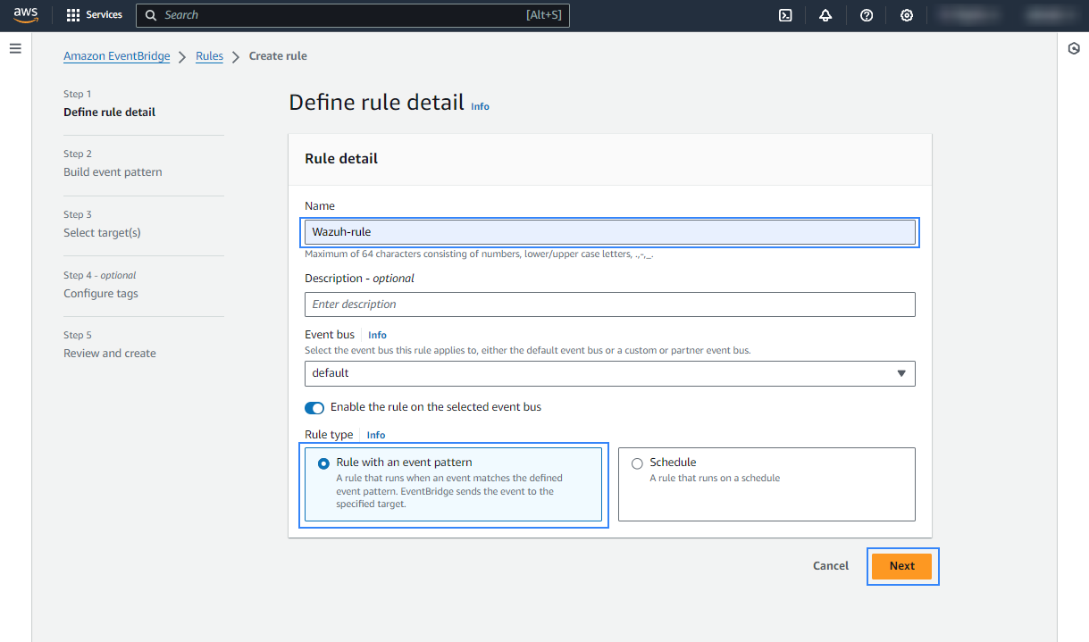 In the Build event pattern section, choose AWS events or EventBridge partner events as Event source.
