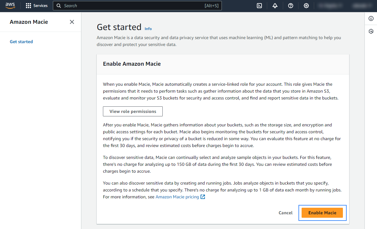Once enabled, Macie provides visibility into data security risks and enables automated protection against those risks. Check the official AWS documentation to learn more about the service.