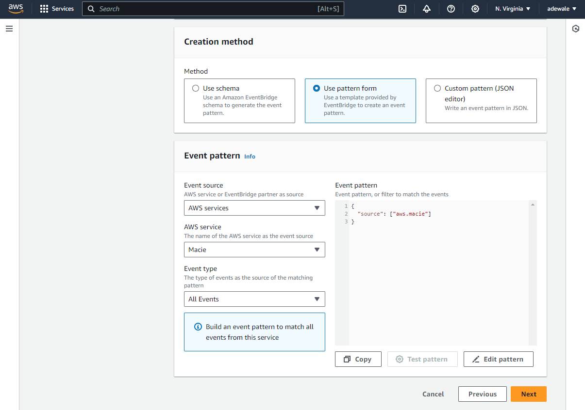 In the Event pattern section, choose AWS services as Event source, Macie as AWS service, and All Events as Event type. Click Next to apply the configuration.
