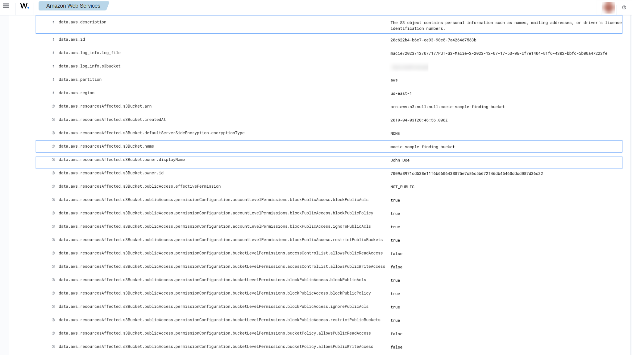 <WAZUH_AWS_BUCKET>with the name of the S3 bucket:<wodle name="aws-s3"> <disabled>no</disabled> <interval>10m</interval> <run_on_start>yes</run_on_start> <skip_on_error>yes</skip_on_error> <bucket type="custom"> <name><WAZUH_AWS_BUCKET></name> <path>macie</path> <aws_profile>default</aws_profile> </bucket> </wodle>