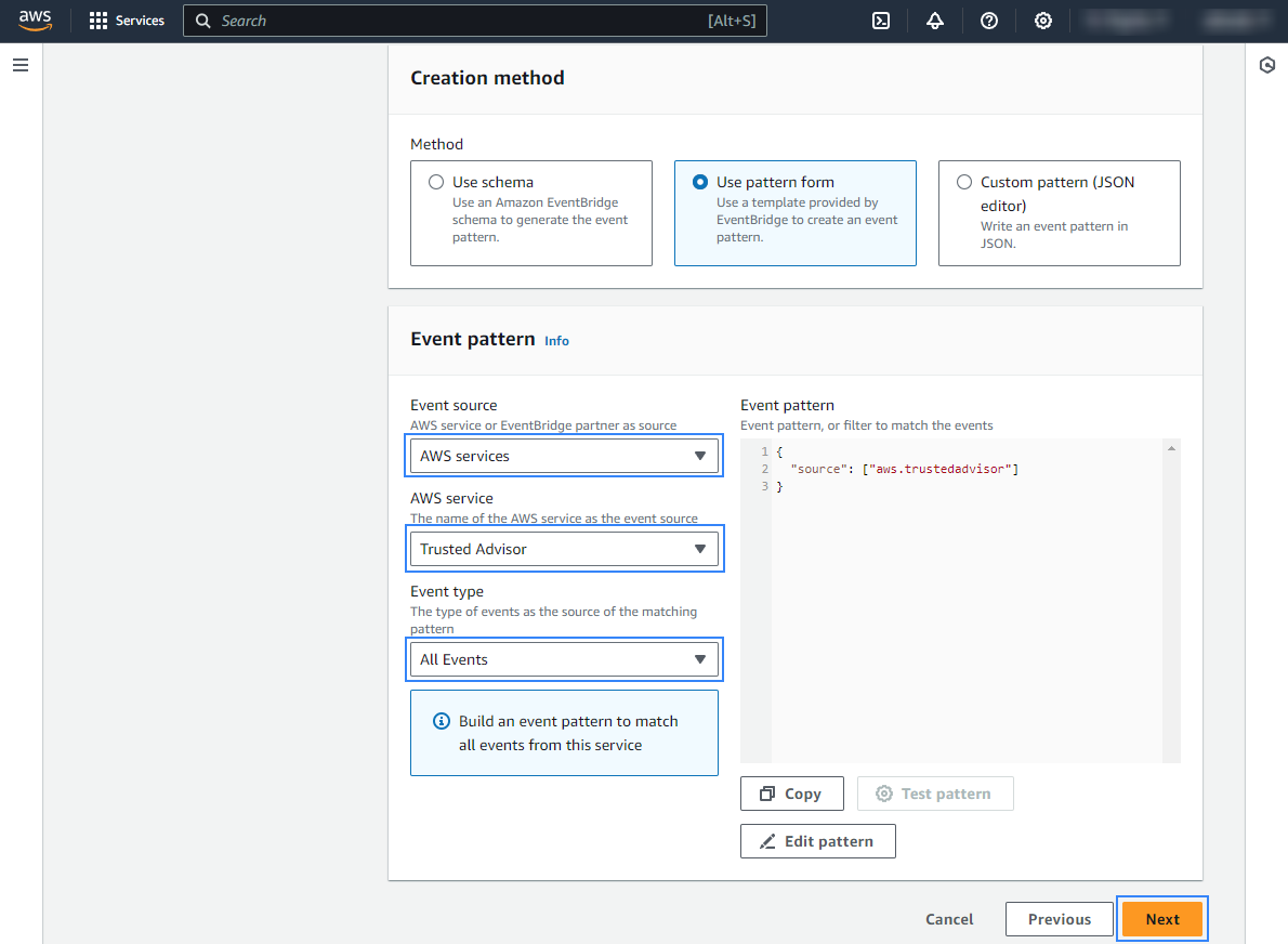 In the Event pattern section, choose AWS services as Event source, Trusted Advisor as AWS service, and All Events as Event type. Click Next to apply the configuration.