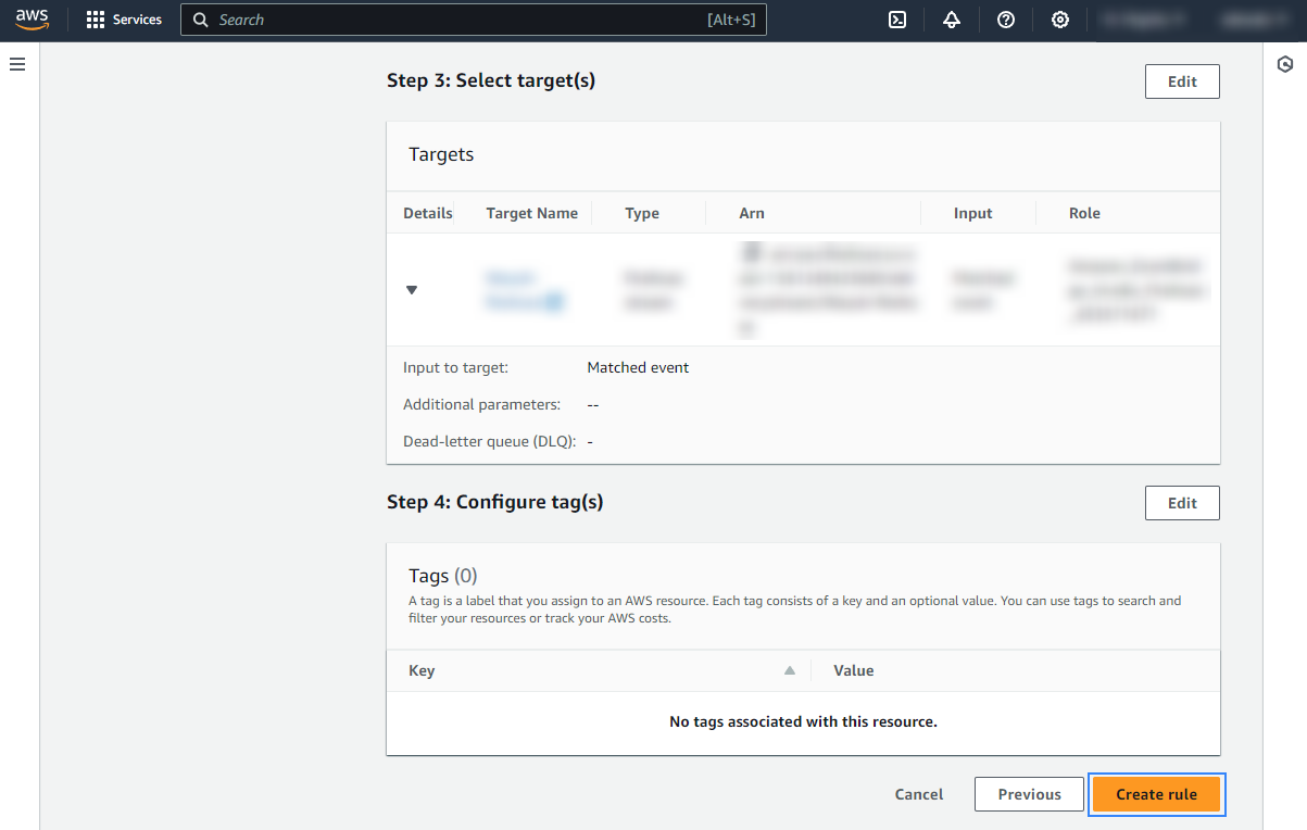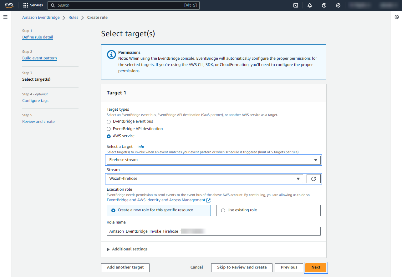 Under Select a target, choose Firehose stream and select the stream created previously. Also, create a new role to access the delivery stream. Click Next to apply the configuration.