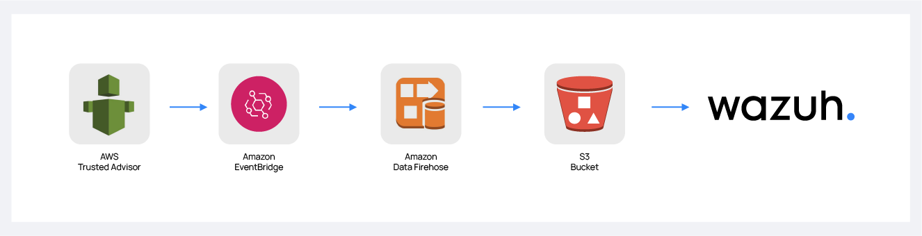 AWS Trusted Advisor helps users optimize their AWS environment by following AWS best practices to provide real-time guidance that aims to reduce cost, increase performance, and improve security. Trusted Advisor logs can be stored in an S3 bucket thanks to Amazon EventBridge and Amazon Data Firehose, allowing Wazuh to process them and generate alerts using the built-in rules Wazuh provides, as well as any custom rules available.