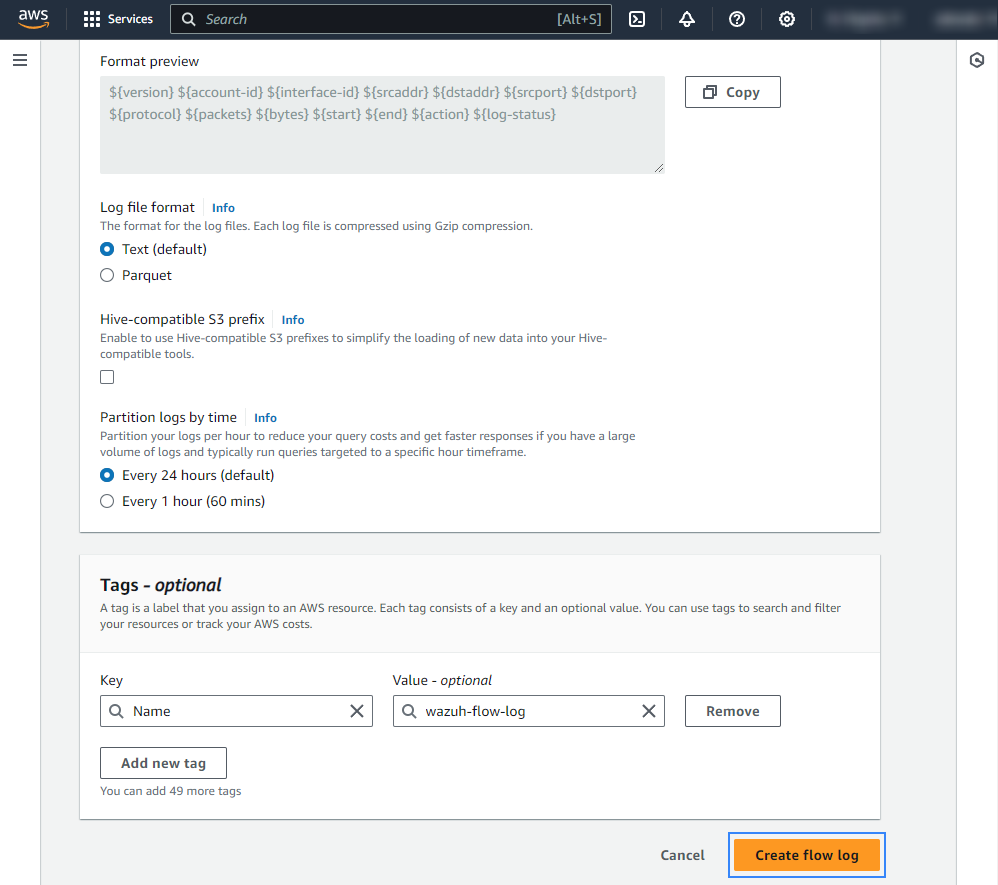 <WAZUH_AWS_BUCKET>with the name of the S3 bucket:<wodle name="aws-s3"> <disabled>no</disabled> <interval>10m</interval> <run_on_start>yes</run_on_start> <skip_on_error>yes</skip_on_error> <bucket type="vpcflow"> <name><WAZUH_AWS_BUCKET></name> <aws_profile>default</aws_profile> </bucket> </wodle>