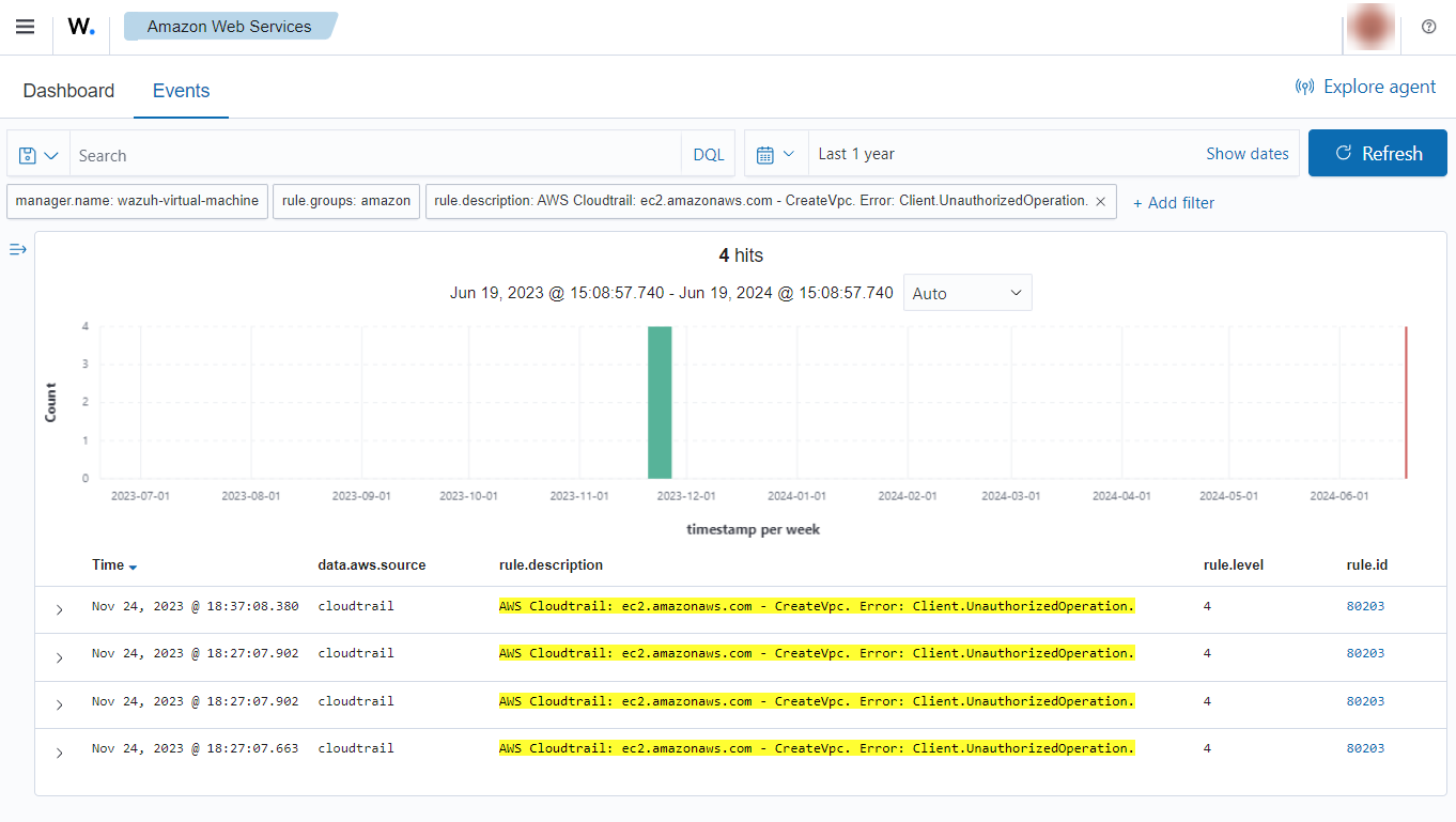 If a user without proper permissions attempts to create a VPC, the following alerts with rule ID 80203 will be shown on the Wazuh dashboard.