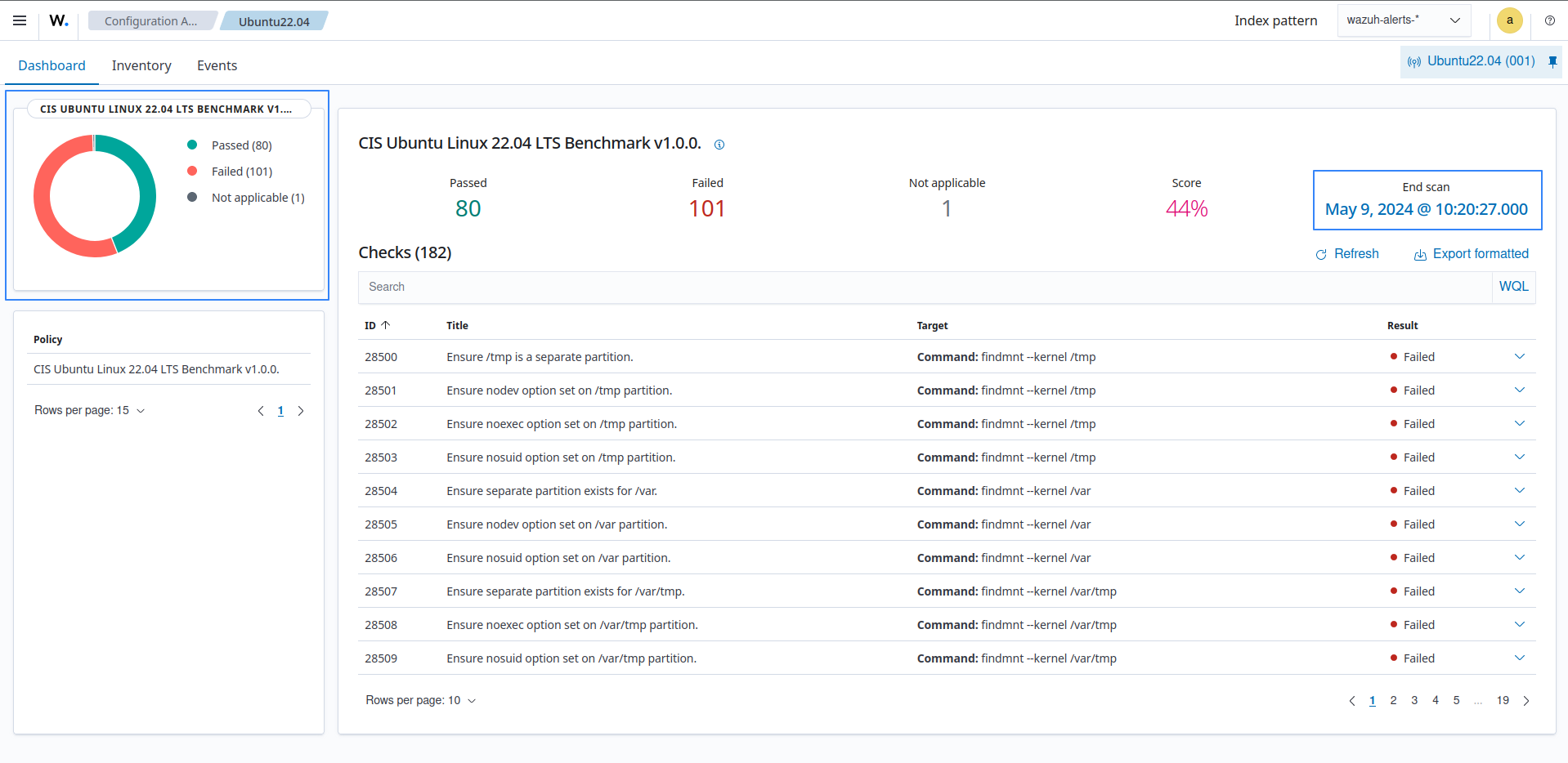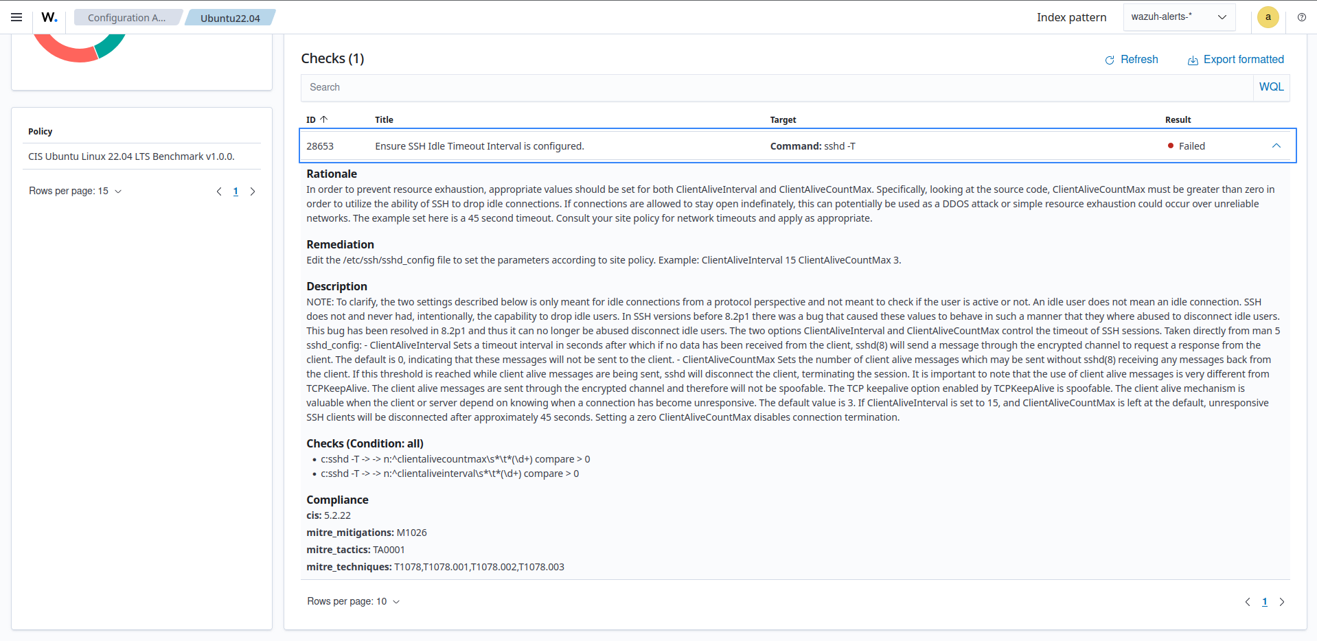 CIS benchmark for Ubuntu Linux 22.04 LTSis an out-of-the-box policy based on the Center for Internet Security (CIS) benchmarks, a well-established standard for host hardening.In this use case, Wazuh runs SCA checks to determine the status of SSH session timeouts on an Ubuntu 22.04 endpoint. The ID of the check is