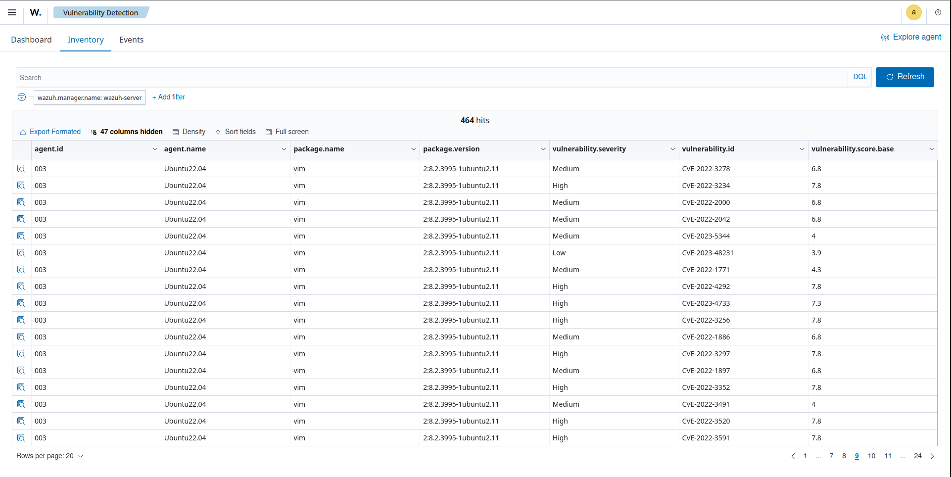 You can view the results on the Wazuh dashboard, which includes information about vulnerable packages on the monitored endpoint. In this case, the vim software installed on the endpoint has vulnerabilities.