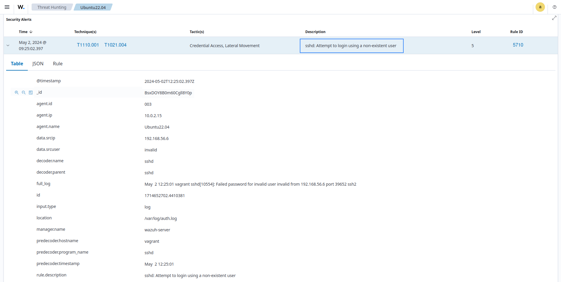 Rule 5710 - sshd: attempt to login using a non-existent user: This rule generates an alert when a non-existent user tries to log in to a system via SSH. The generated alert contains the information required by requirement 10.2.2 (user identification, type of event, date and time, success and failure indication, origination of event, and identity or name of affected data, system component, resource, or service). The screenshot below shows the alert generated on the dashboard: