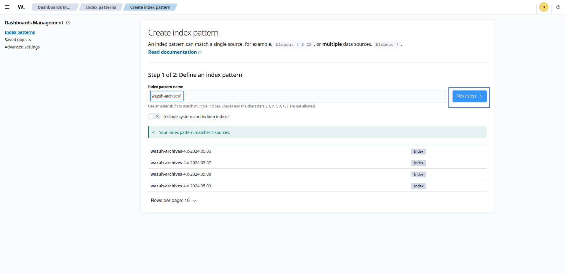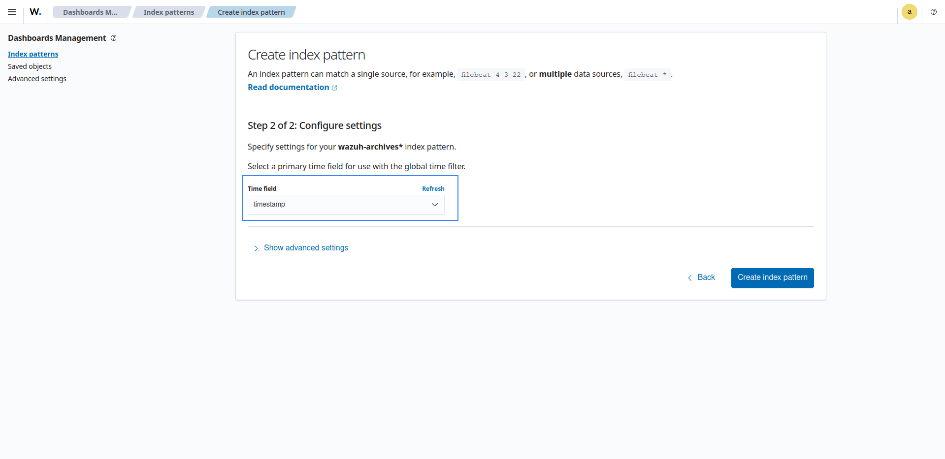 wazuh-archives-*as the index pattern name.