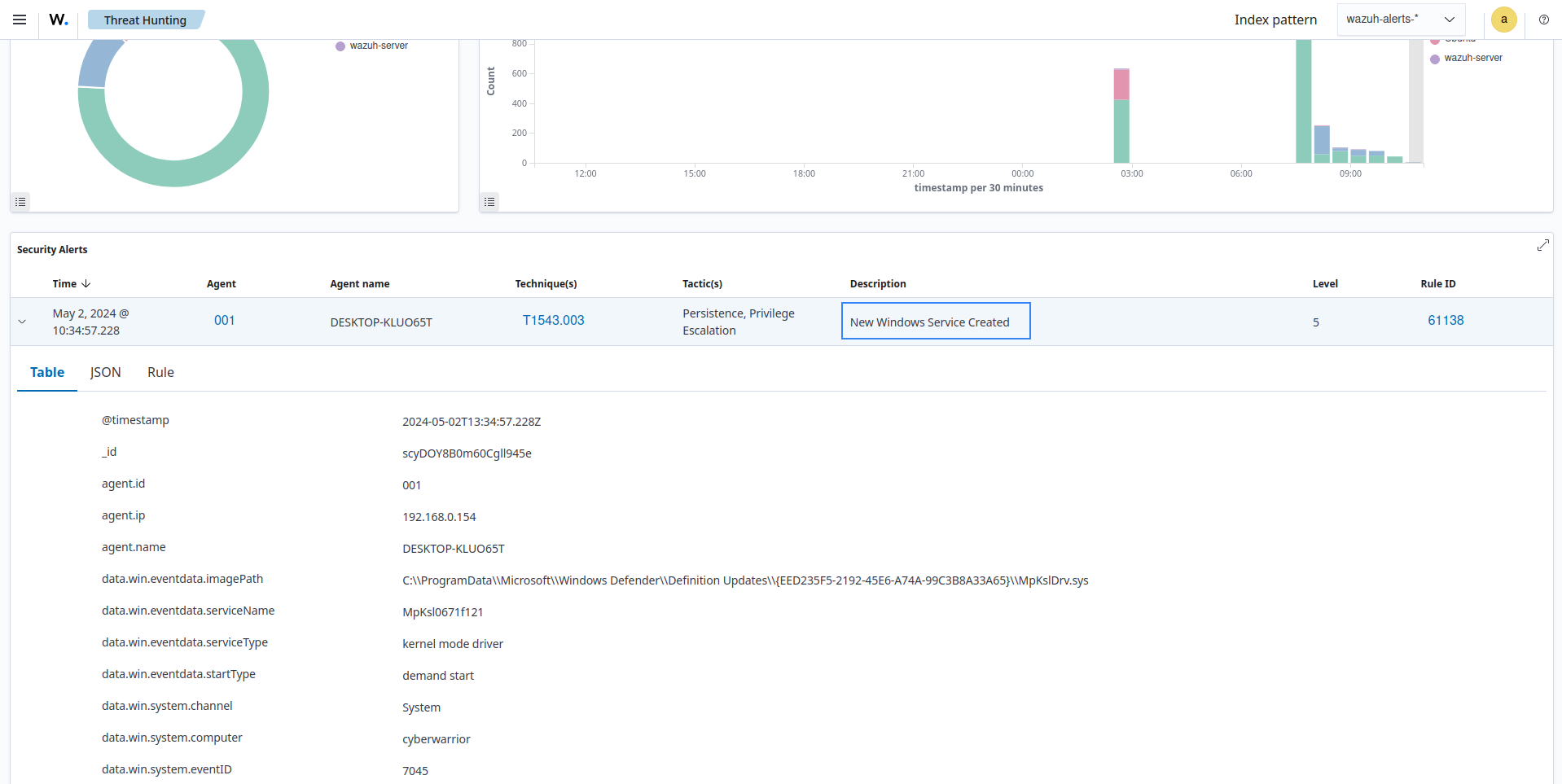 Rule 61138: New Windows Service Created. The analysis engine analyzes the Windows system logs to find out if a new service was created generating an alert from this rule.