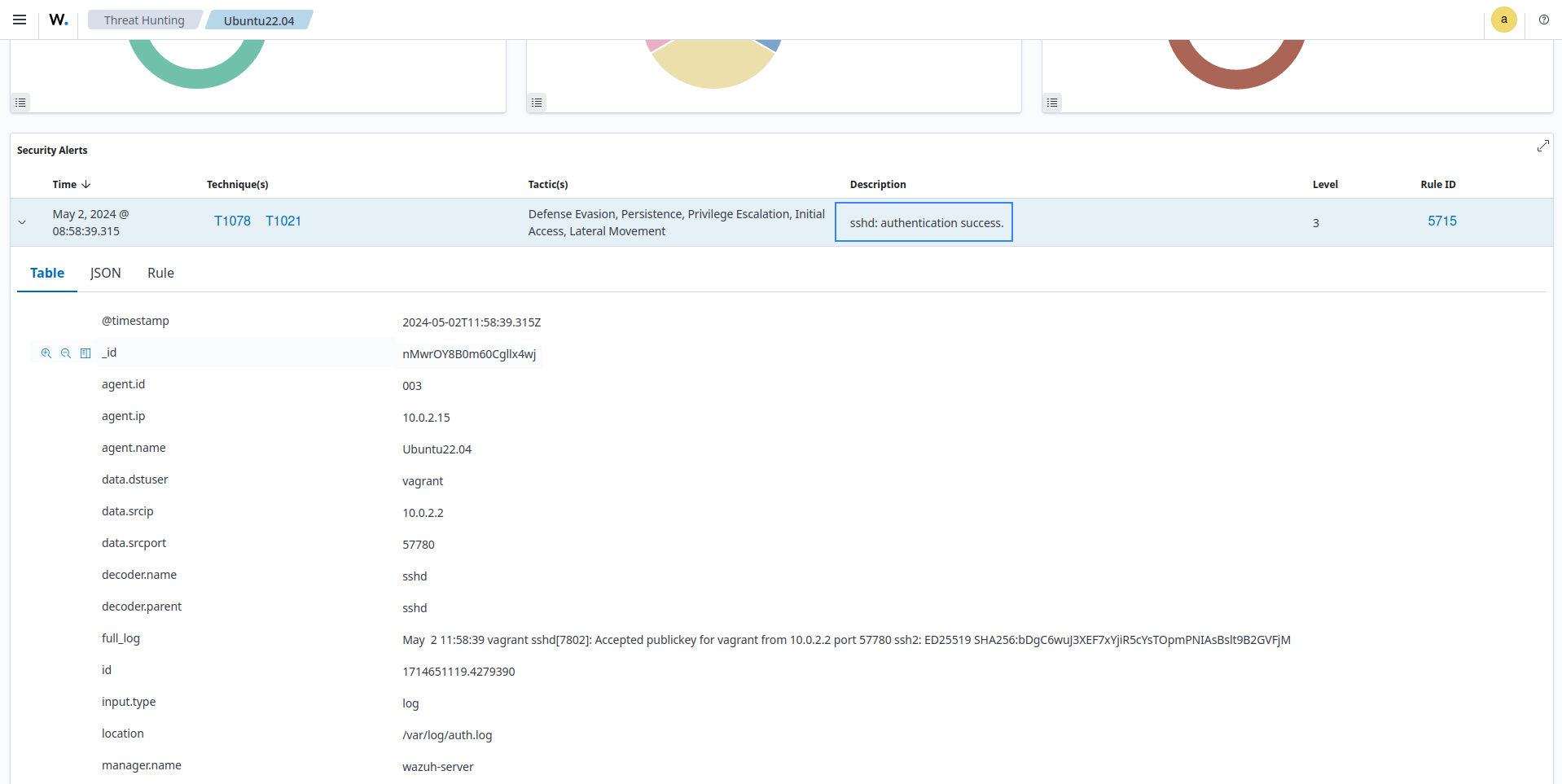 Rule 5715 - sshd: authentication success: This rule generates an alert when a user successfully logs into a system via SSH. The generated alert contains the information required by requirement 10.2.2 (user identification, type of event, date and time, success and failure indication, origination of event, and identity or name of affected data, system component, resource, or service). The screenshot below shows the alert generated on the dashboard: