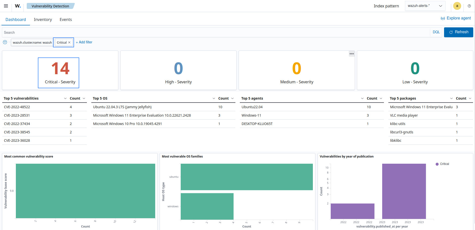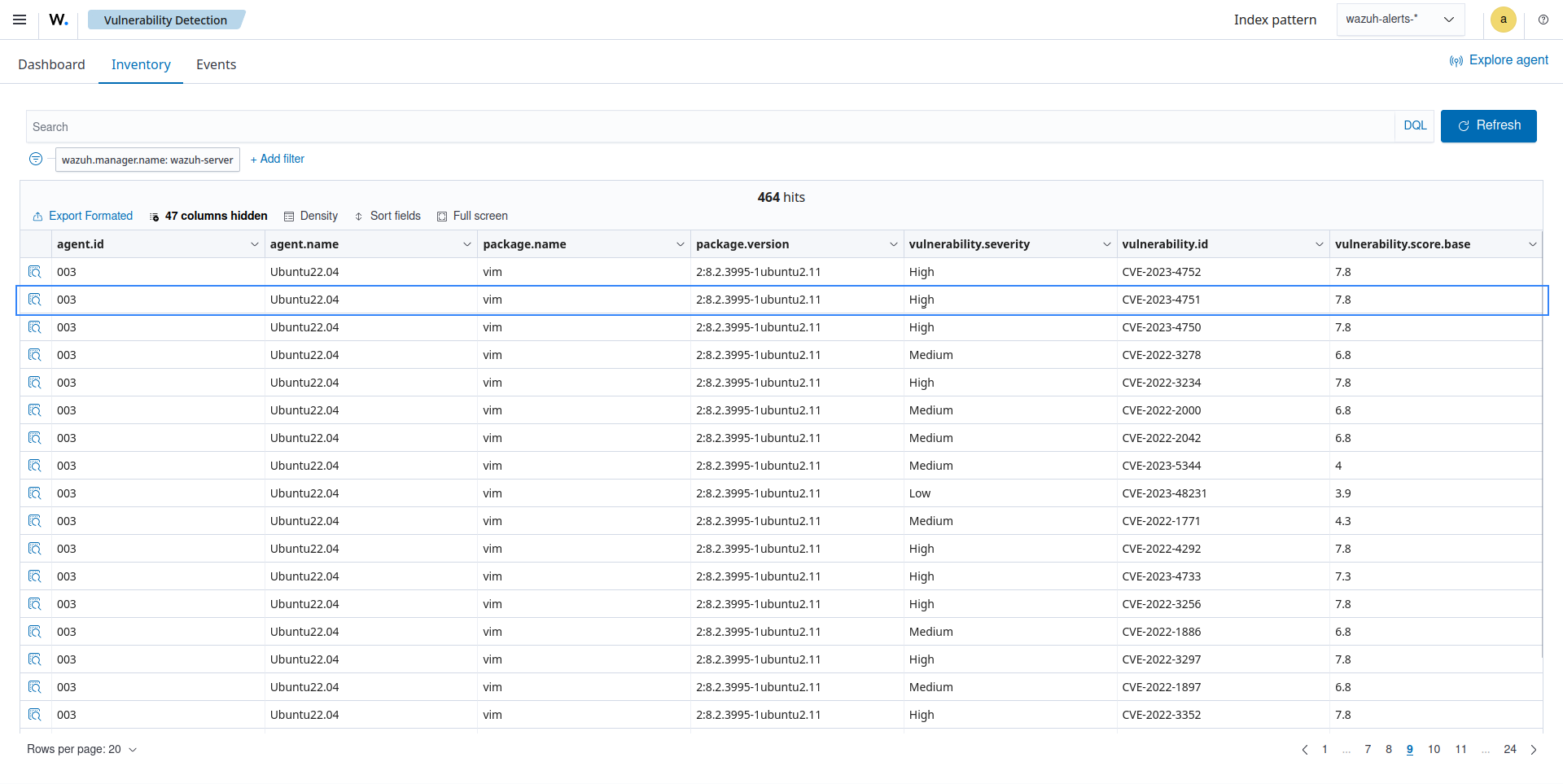 You can see the results on the Wazuh dashboard. They include details of vulnerable packages, for example, vulnerabilities in the