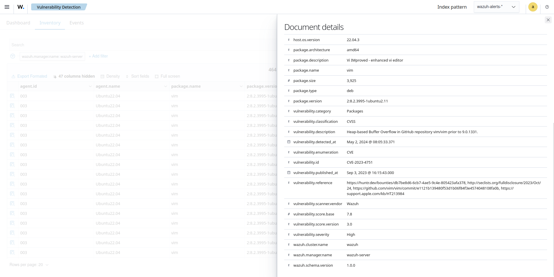 vimapplication. When you select a specific vulnerability detected, the Wazuh dashboard shows an overview of the issue and its status on the agent.