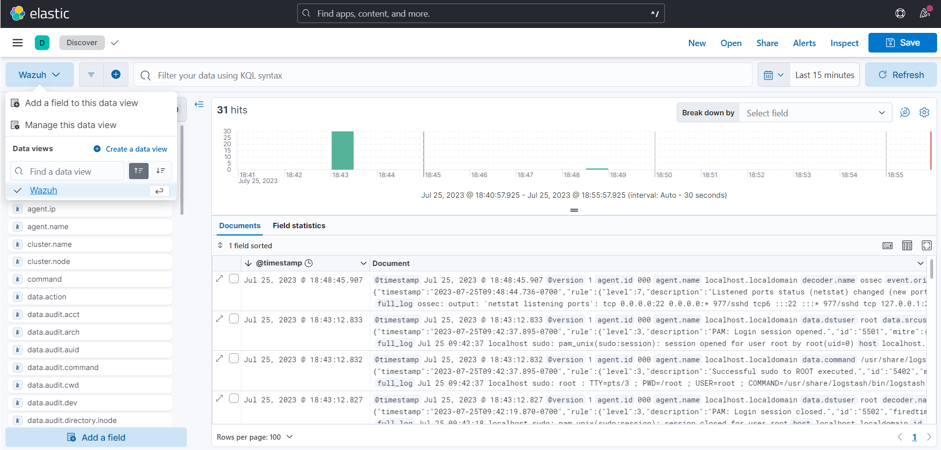 To check the integration with Elasticsearch, navigate to Discover in Kibana and verify that you can find the Wazuh security data with the data view name you entered.
