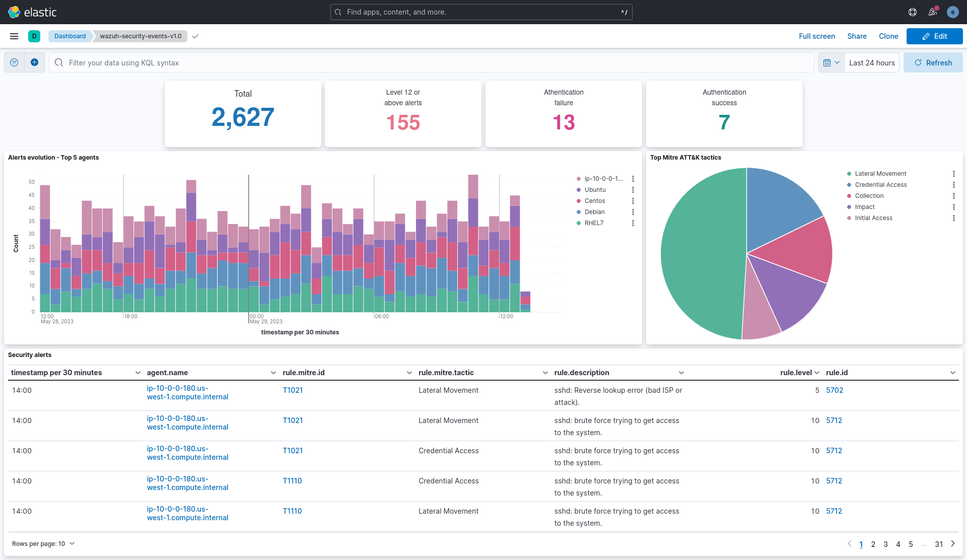 Wazuh provides several dashboards for Elastic Stack. After finishing with the Elasticsearch integration setup, these dashboards display your Wazuh alerts in Elastic.