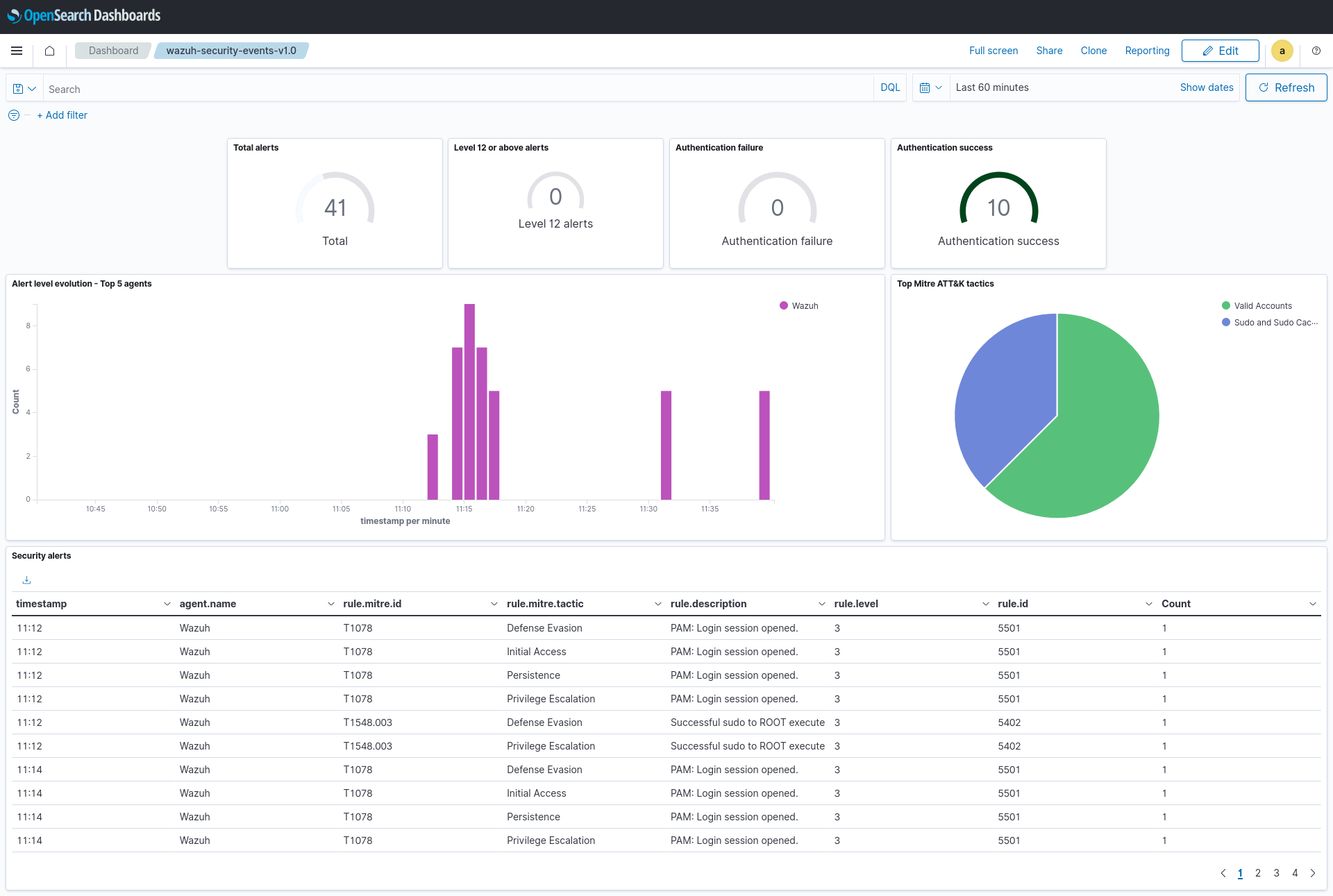 Wazuh provides several dashboards for OpenSearch. After finishing with the OpenSearch integration setup, these dashboards display your Wazuh alerts in OpenSearch.
