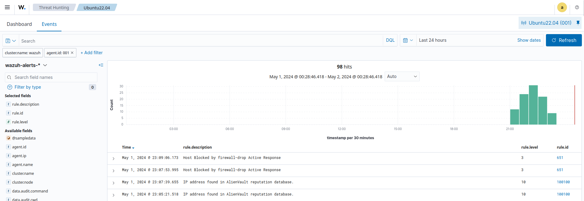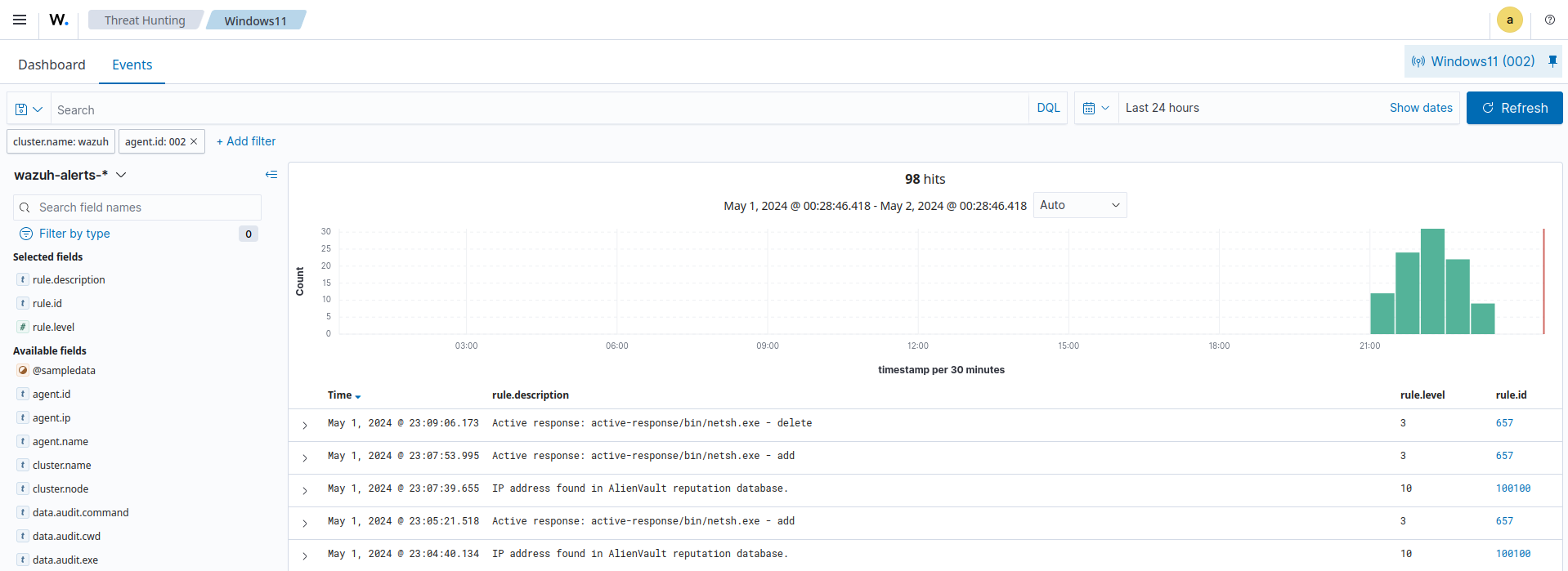 You can visualize the alert data in the Wazuh dashboard. To do this, go to the Threat Hunting module and add the filters in the search bar to query the alerts.