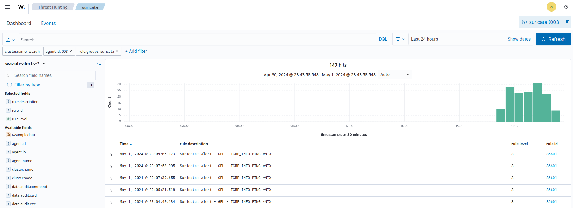 Wazuh automatically parses data from /var/log/suricata/eve.json and generates related alerts on the Wazuh dashboard.
