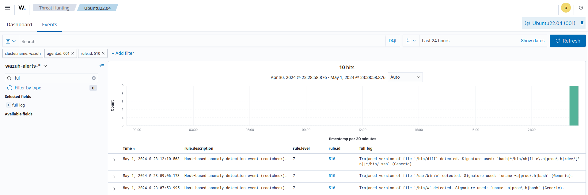 location:rootcheck AND rule.id:510 AND data.title:Trojaned version of file detected.Additionally, using the Filter by type search field, apply the