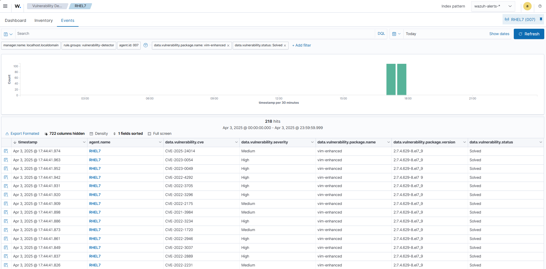 After removing the vulnerable package from the endpoint, to view the resolved vulnerability alerts, simply change the filter values to data.vulnerability.package.name: vim AND data.vulnerability.status:Solved