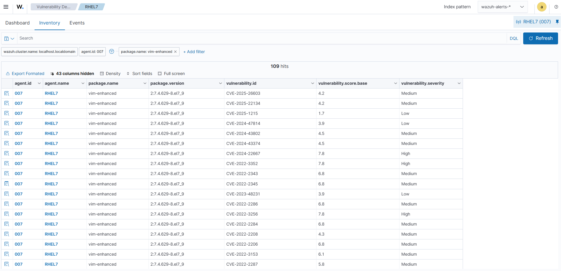 2:7.4.629-8which is known to be vulnerable, on the RHEL 7 endpoint. Wait approximately 10 minutes (or the duration set in your Syscollector<interval>) for a new scan to run and the vulnerability to be detected.Remove the Vim package to fix the vulnerability. Wait 10 minutes for the syscollector to run a new scan to confirm the vulnerability has been cleared.