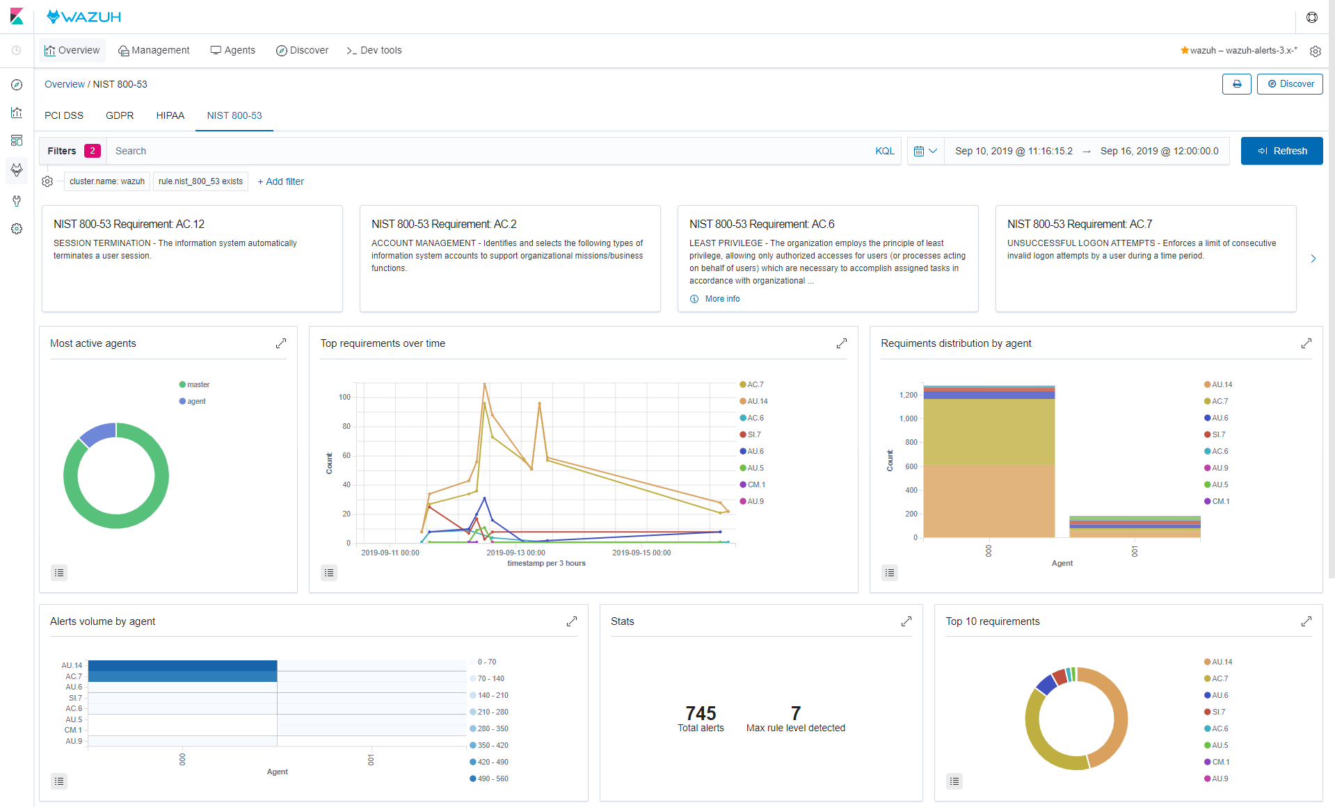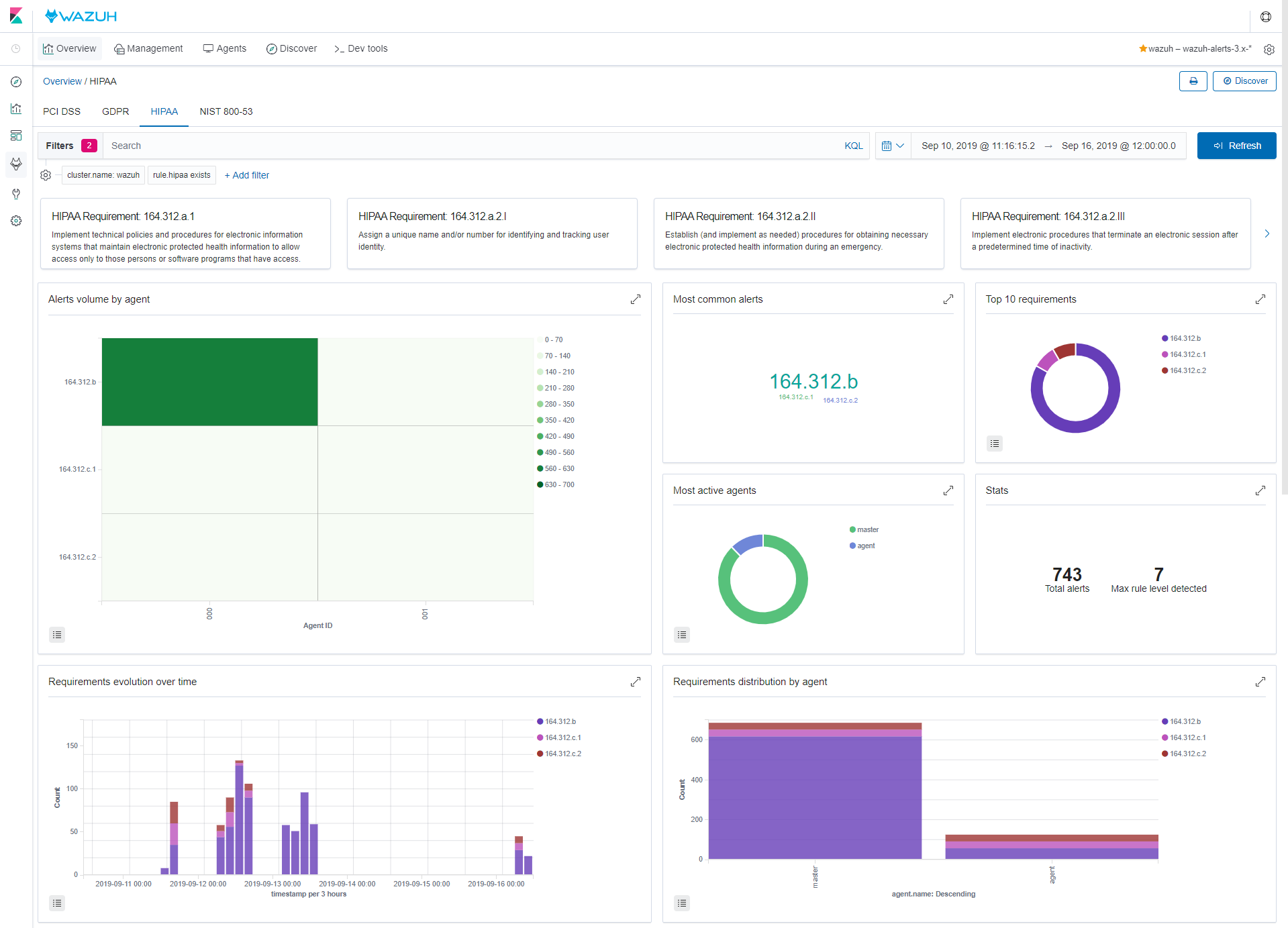 HIPAAandNIST 800 53new dashboards for the recently added regulatory compliance mapping.Added support for custom Kibana spaces.