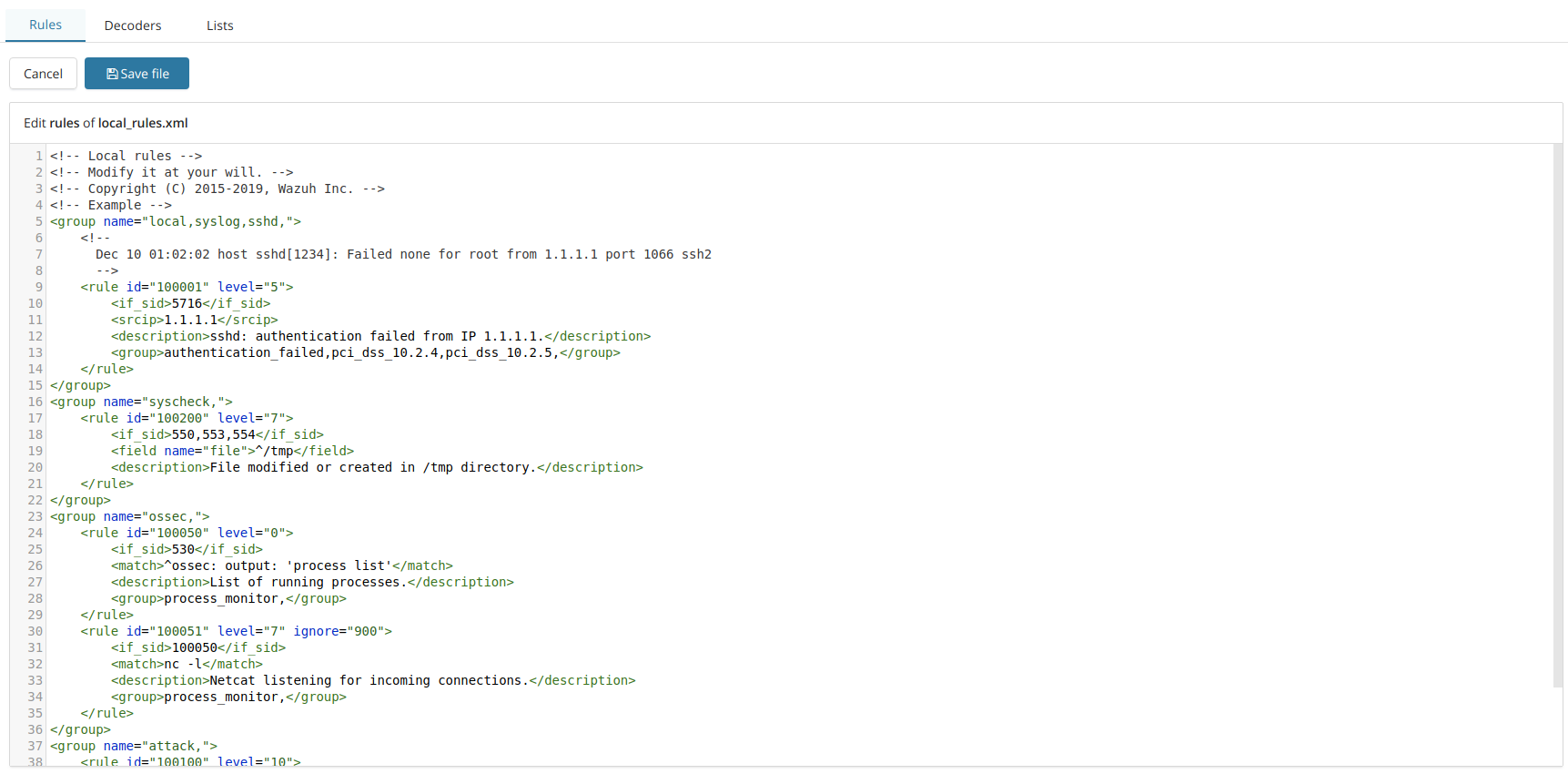 Thanks to the recently added Wazuh API endpoints, the app comes with multiple improvements for the ruleset section, including rules, decoders and CDB list management.