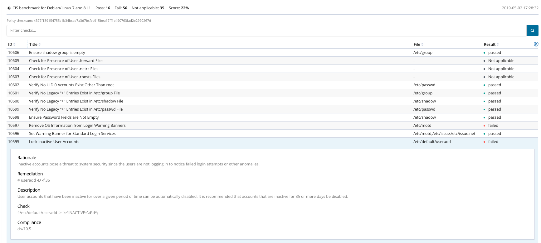 Security Configuration Assessment (SCA) is a new module created to improve hardening and policy monitoring capabilities in Wazuh. Policy files are now in YAML format, making easier modifications and reading. Policies have been extended, useful compliance information has been added to each policy (rationale, remediation, CSC, etc.). Scan results are sent and stored in Manager side, being accessible using both the Wazuh API and the Wazuh app.