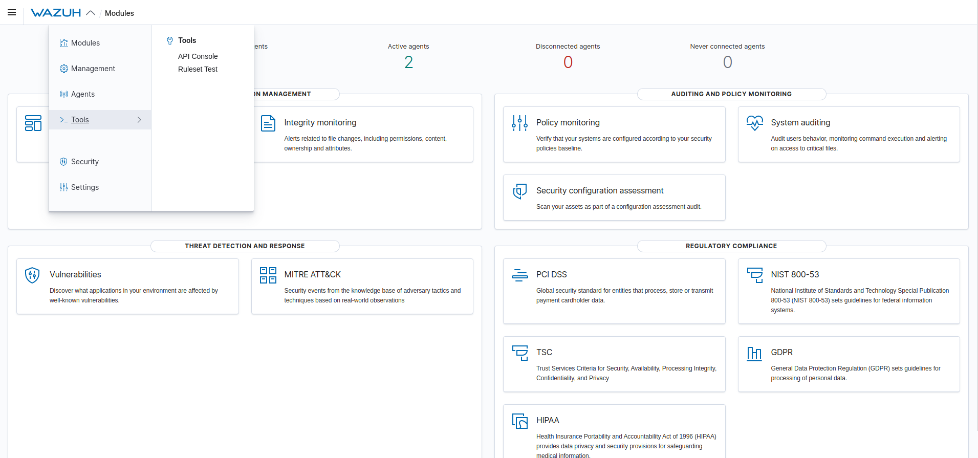 The Dev Tools feature is renamed as API Console and it is now found, together with the new Ruleset Test feature, inside the new Tools section under the Wazuh Kibana plugin menu.