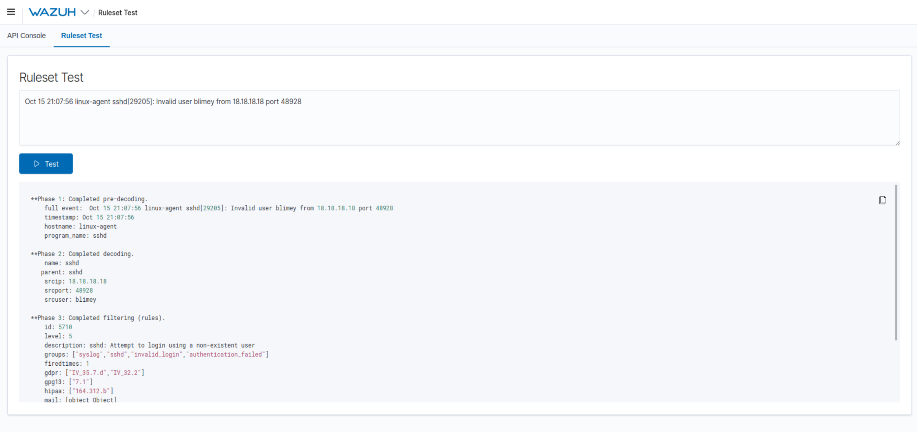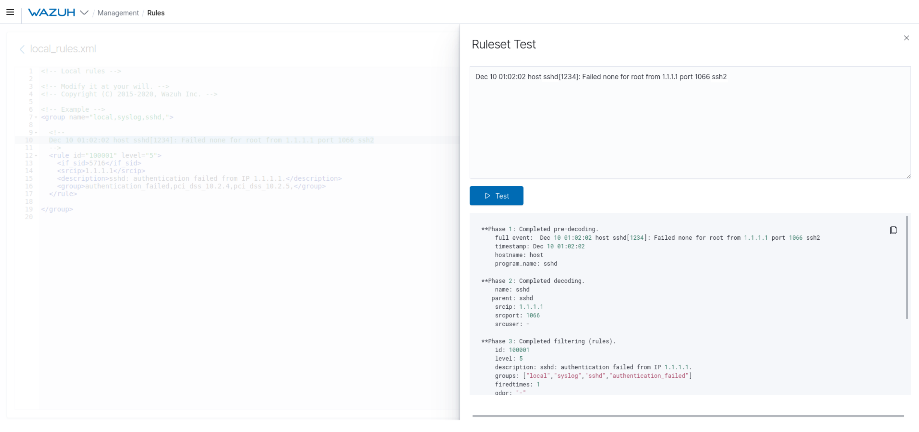 #1434 A new Ruleset Test tool is added under the Tools menu and in the action bar of the Edit Rules and Edit Decoders sections. You can now test sample logs directly on the Wazuh user interface and see how the ruleset reacts to specific log messages.