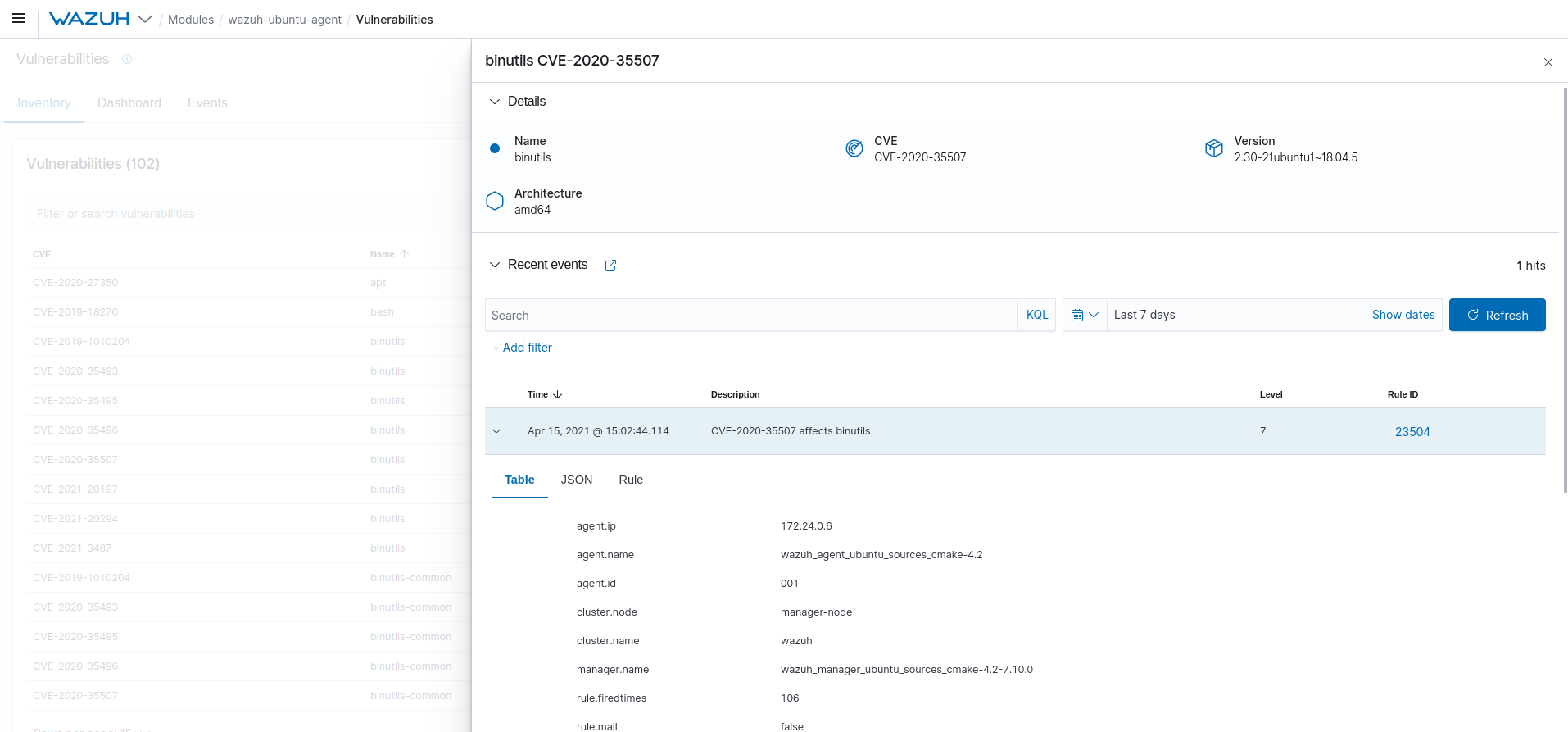 Wazuh now gives you enhanced insight into the CVE that are affecting an agent. The newly added Inventory tab in the Vulnerabilities module allows you to visualize information such as package name, package version, package architecture, and the CVE ID that affects the package, and more. You can also access the vulnerability data flyout to expand on the specifics of each vulnerability entry detailed in the Inventory.