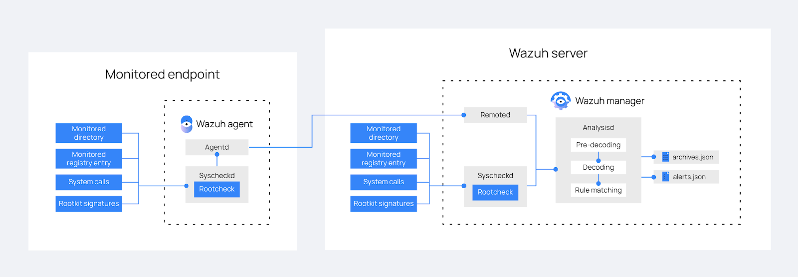 The image below describes the steps Wazuh performs to detect malicious behavior on a monitored endpoint.