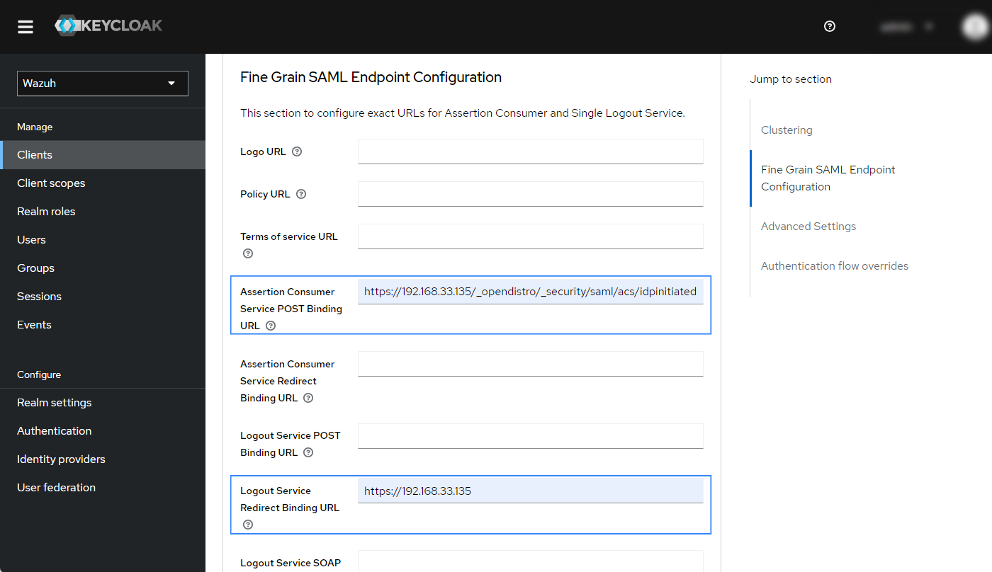 https://<WAZUH_DASHBOARD_URL>/_opendistro/_security/saml/acs/idpinitiatedLogout Service Redirect Binding URL:
