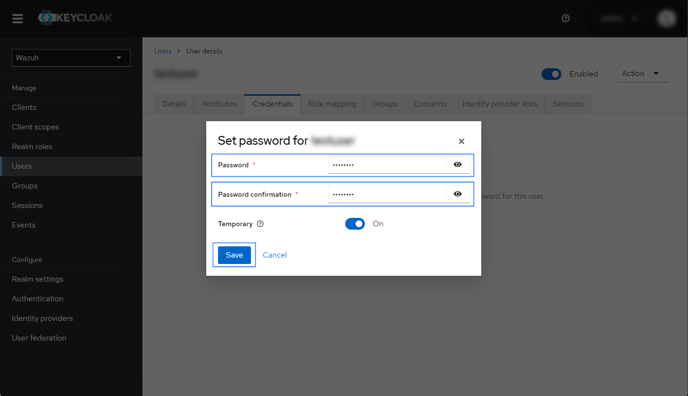 Navigate to Users > Credentials > Set password and input a password for the newly created user. You will use these credentials to log in to the Wazuh dashboard.