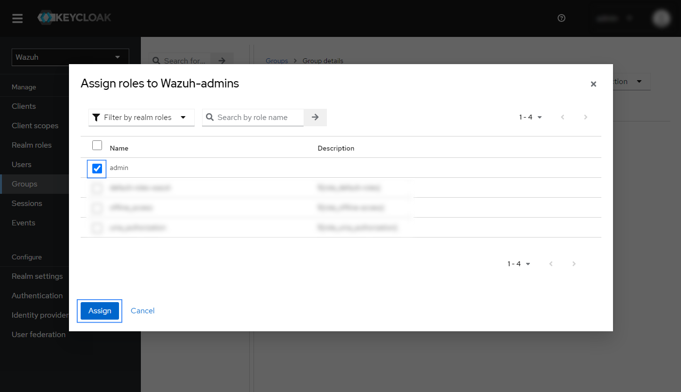 In the newly created group details, go to Role Mapping > Assign role and select the admin role created in step 3. Click on Assign to apply the configuration.