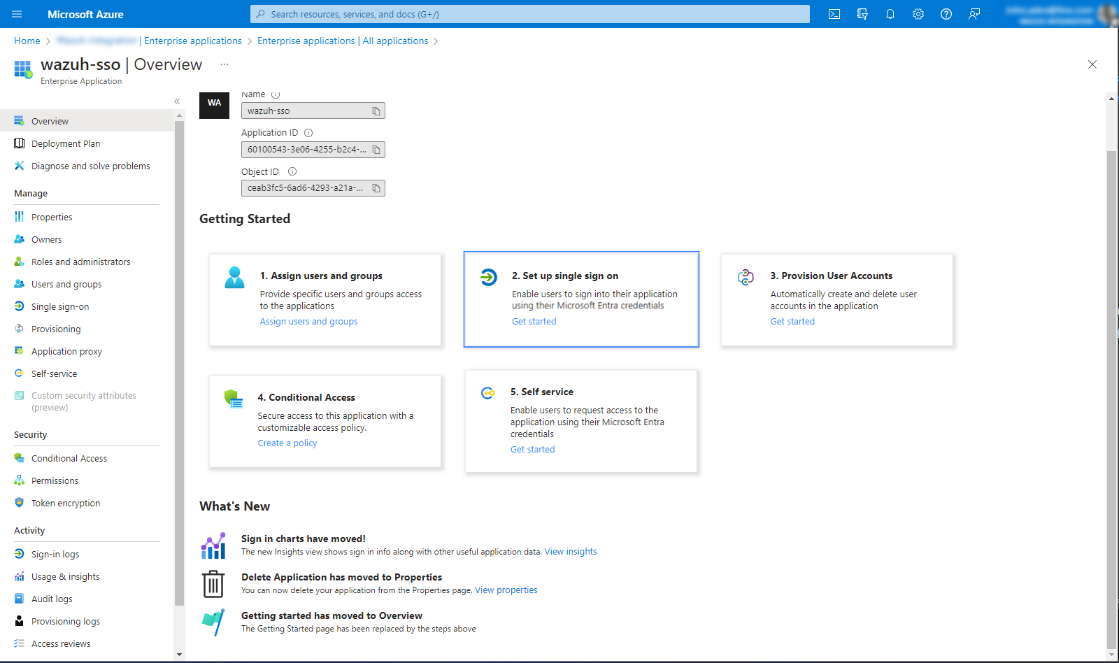 Note the necessary parameters. In the Enterprise applications menu, select your application and then click on Single sign-on. Note some parameters that will be used in the Wazuh indexer configuration.