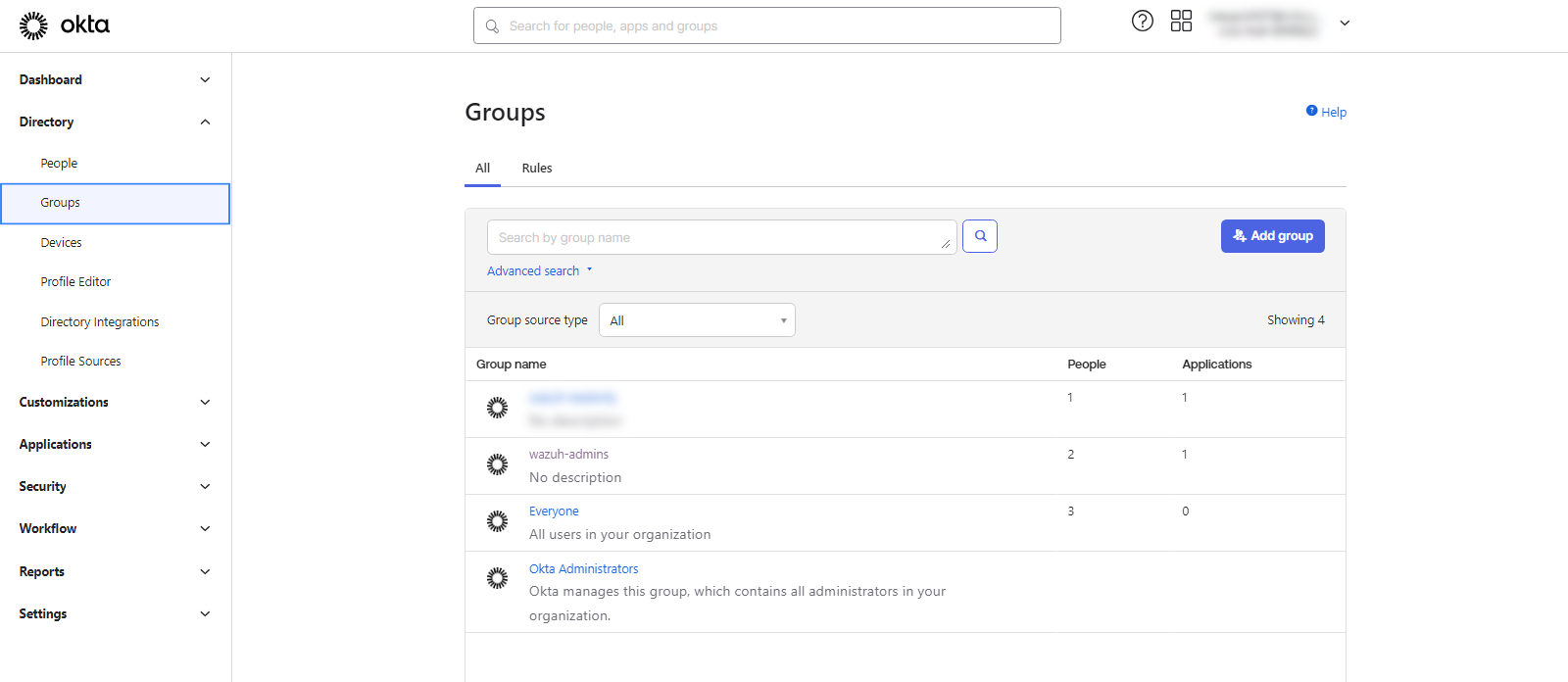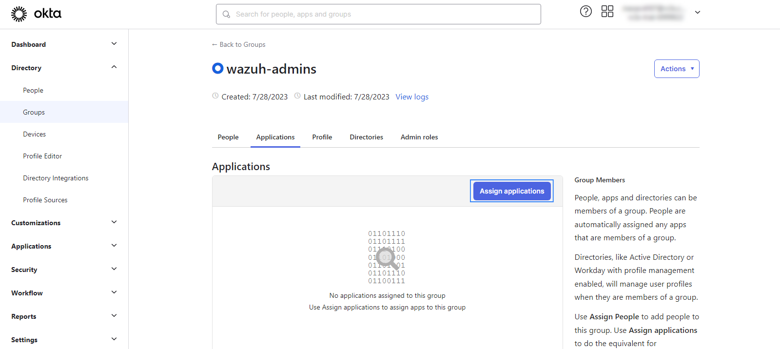 wazuh-admins. This name will be used as ourbackend_rolesinroles_mapping.yml.Add the new user to the new group. Navigate to Directory > Groups and select your group. Click on Assign People and add the user to the group created.