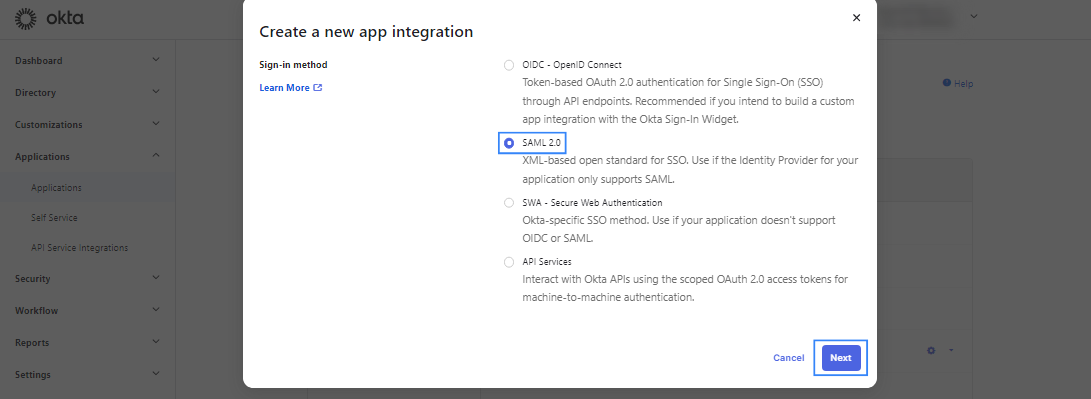 In the Create a new application integration window, select SAML 2.0 and click Next.