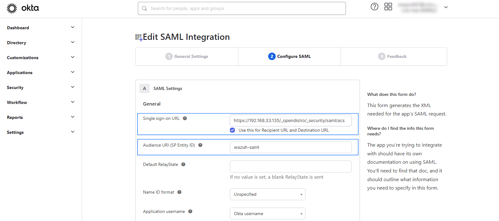 https://<WAZUH_DASHBOARD_URL>/_opendistro/_security/saml/acsand replace the<WAZUH_DASHBOARD_URL>field with the corresponding URL.Audience URI (SP Entity ID): input