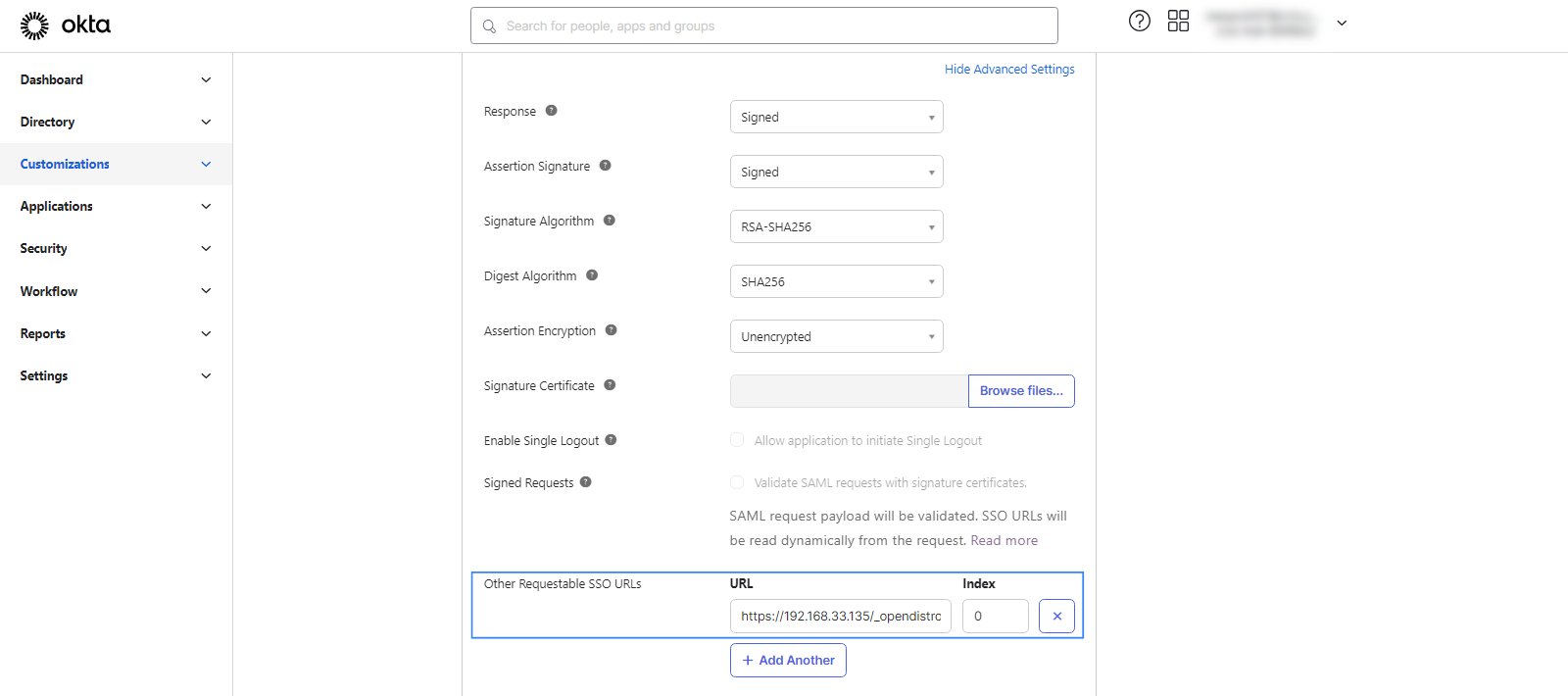wazuh-saml. This is theSP Entity IDvalue which will be used later in theconfig.ymlon the Wazuh indexer instance.Other Requestable SSO URLs: click on Show Advanced Settings to access this option. Input
